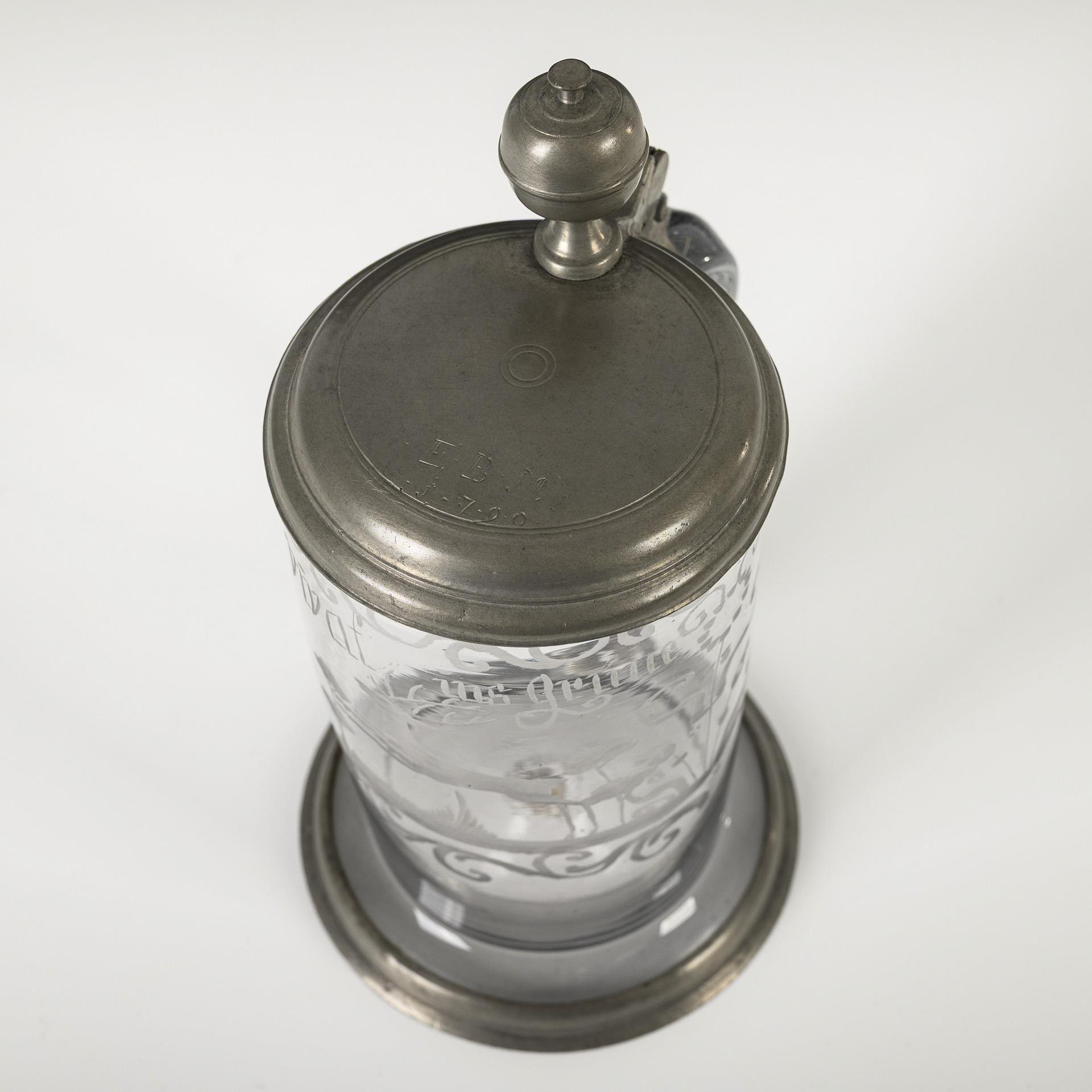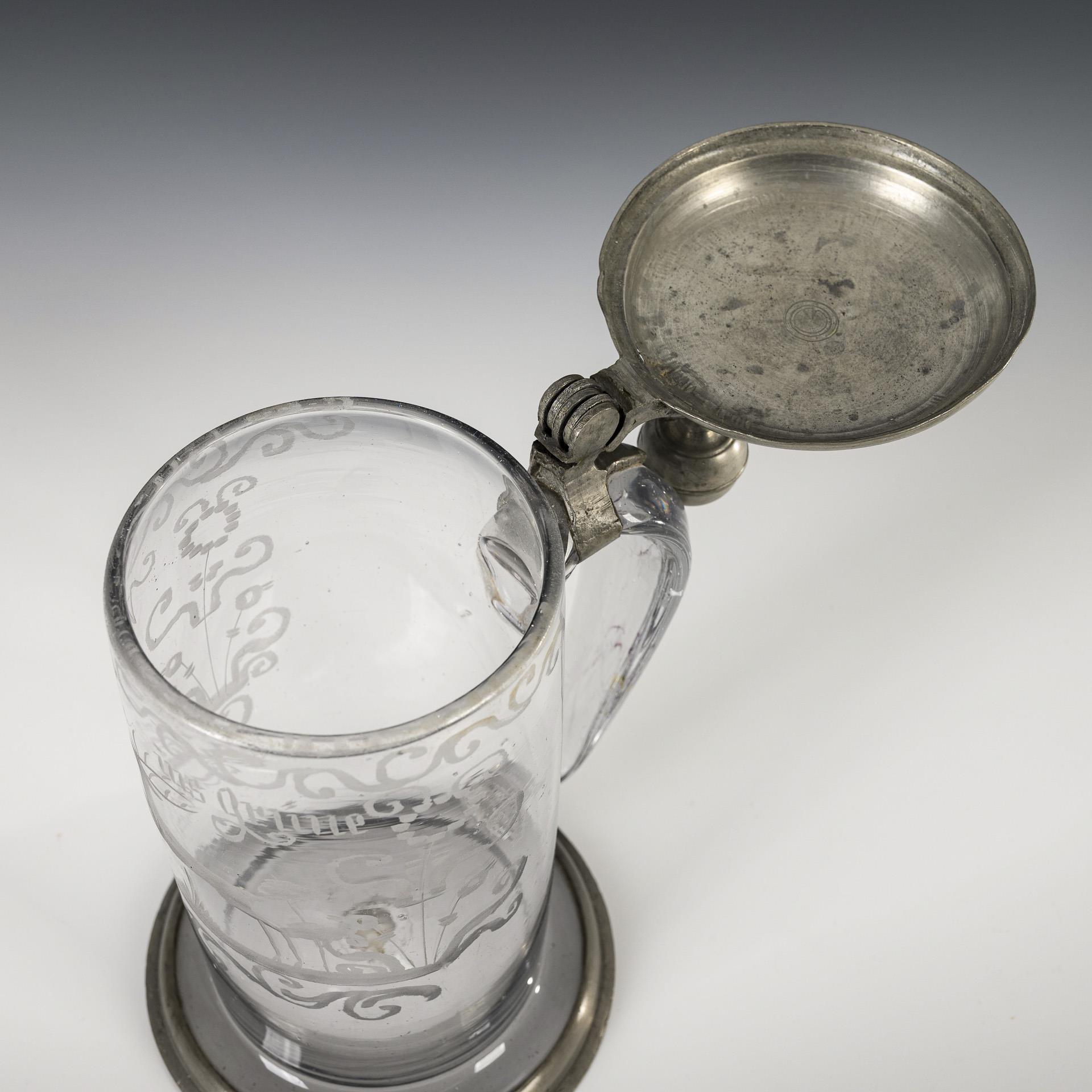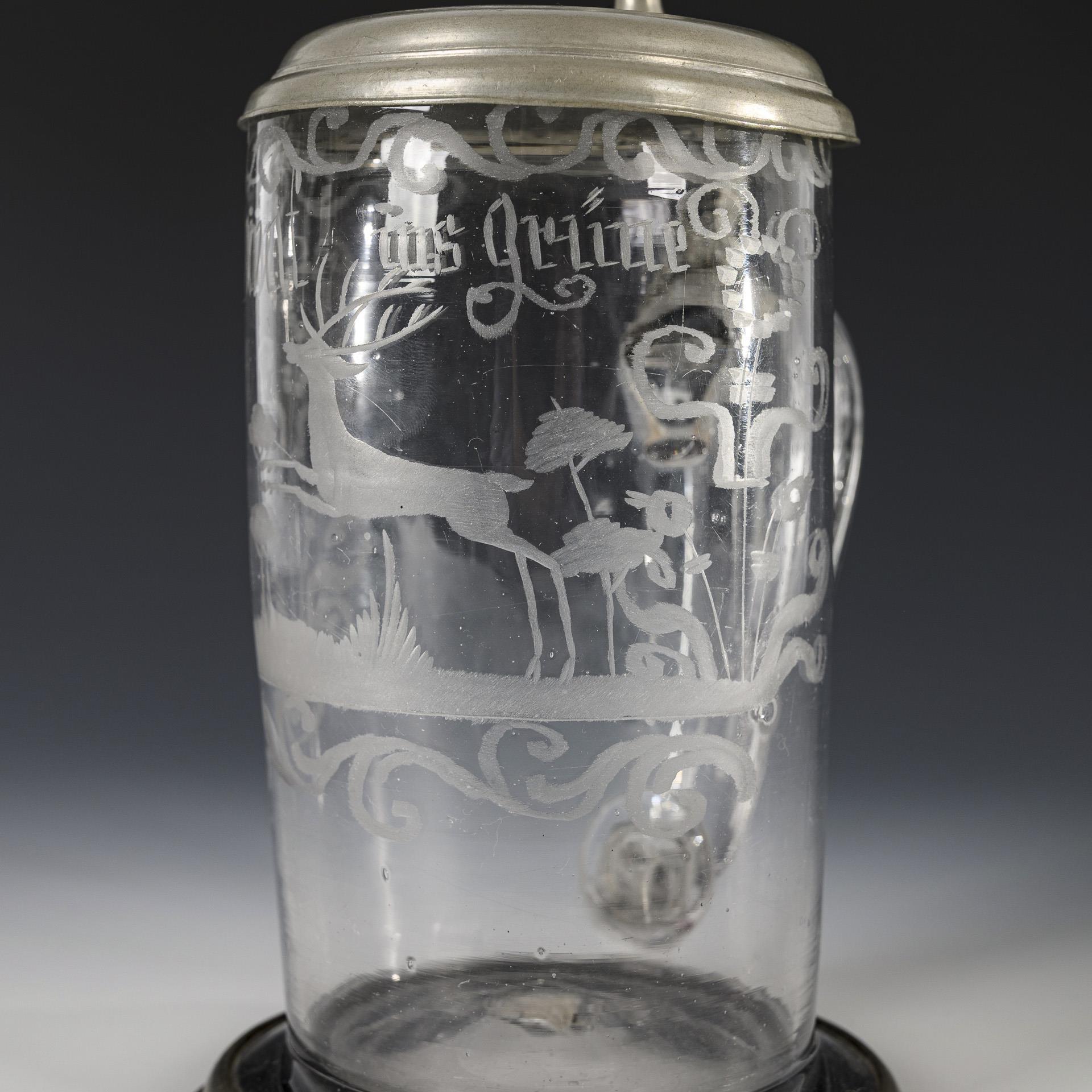 Leicht konvexer Walzenkrug mit ausgestelltem, zinnmontiertem Stand, Bandhenkel und zinnmontiertem Scharnierdeckel mit Kugeldrücker; Abriss. Schauseitig die gravierte Darstellung eines springenden Hirsches, darüber die Losung "vivat ins grüne".