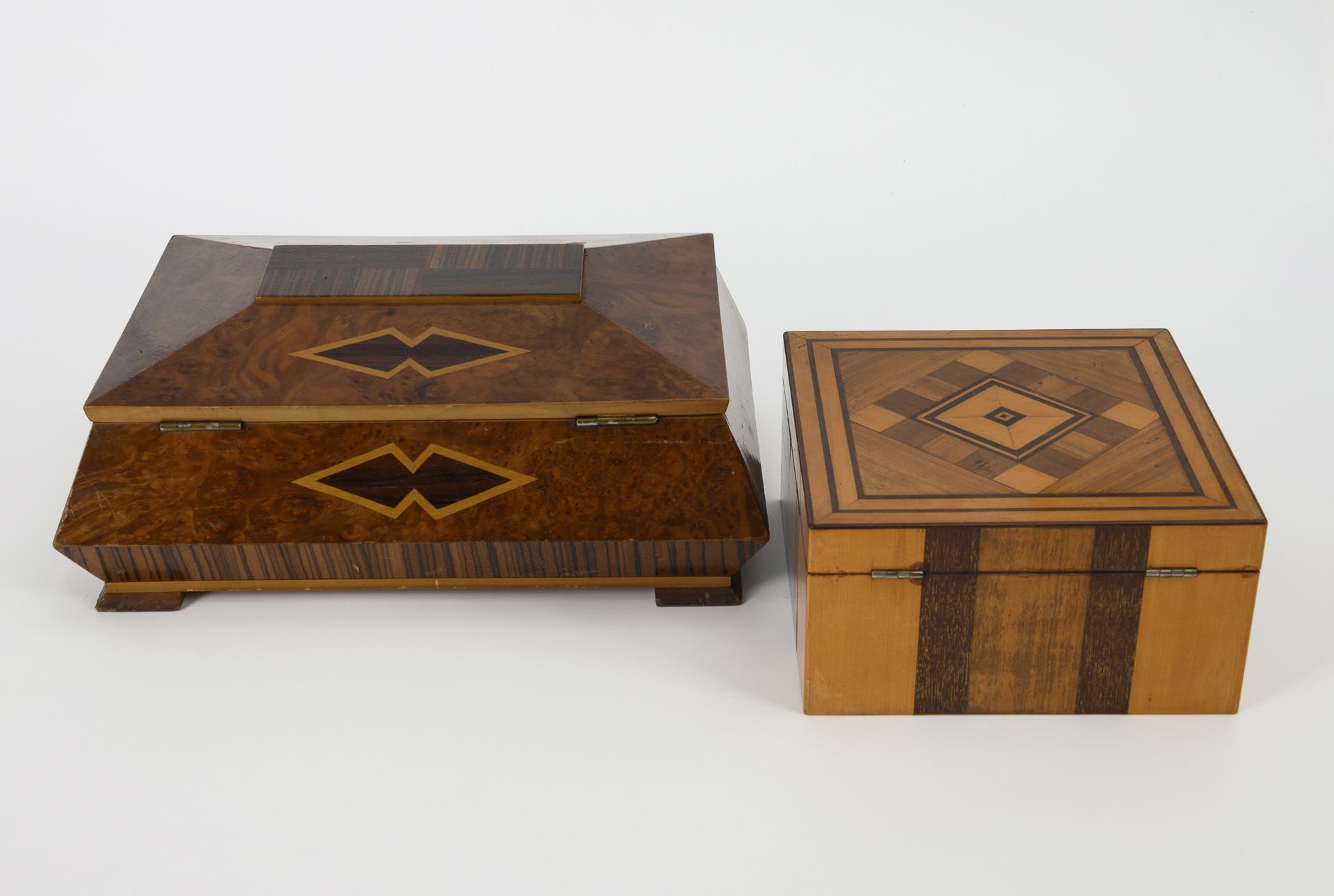 Verschiedene Hölzer furniert/marketiert, z.B. Palisander, Zebraholz, Maserholz, Ahorn, teils gefärbt. 14 x 35 x 25 cm bzw. 11 x 20 x 20 cm.