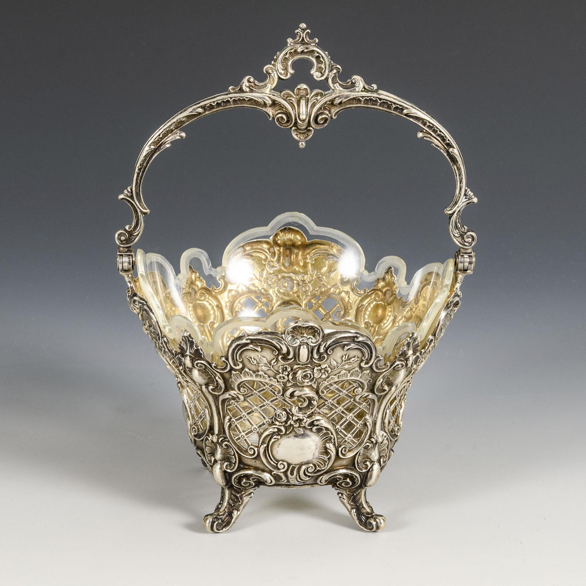 Im Stil des Rokoko gestaltetes Durchbruchkörbchen mit Scharnierhenkel (187 g). Glaseinsatz mit kleinen Randbestoßungen.