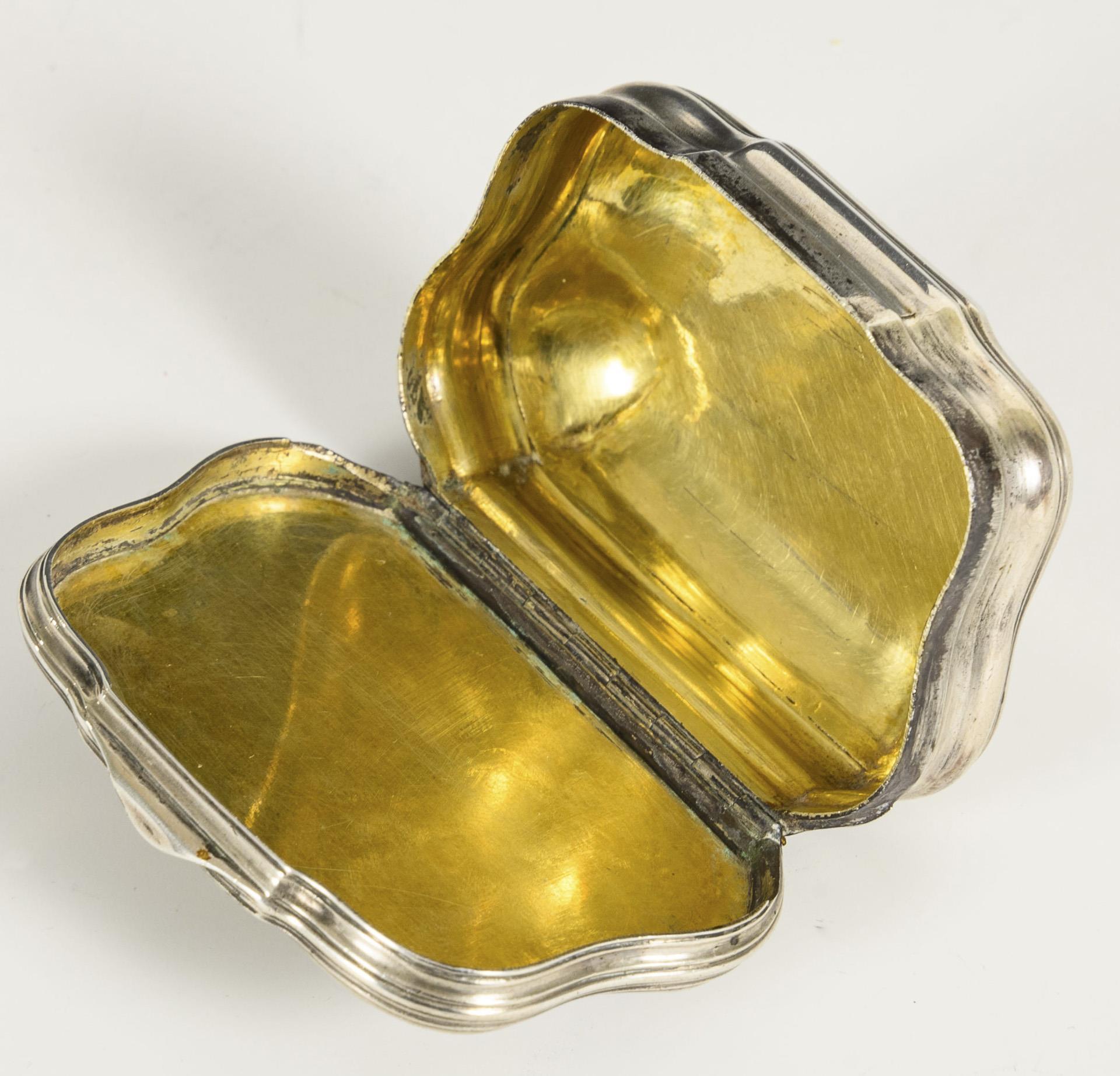 Kleine Tabatiere mit figürlich reliefiertem Scharnierdeckel. Deckel innen wohl nachträglich mit Platte versehen.