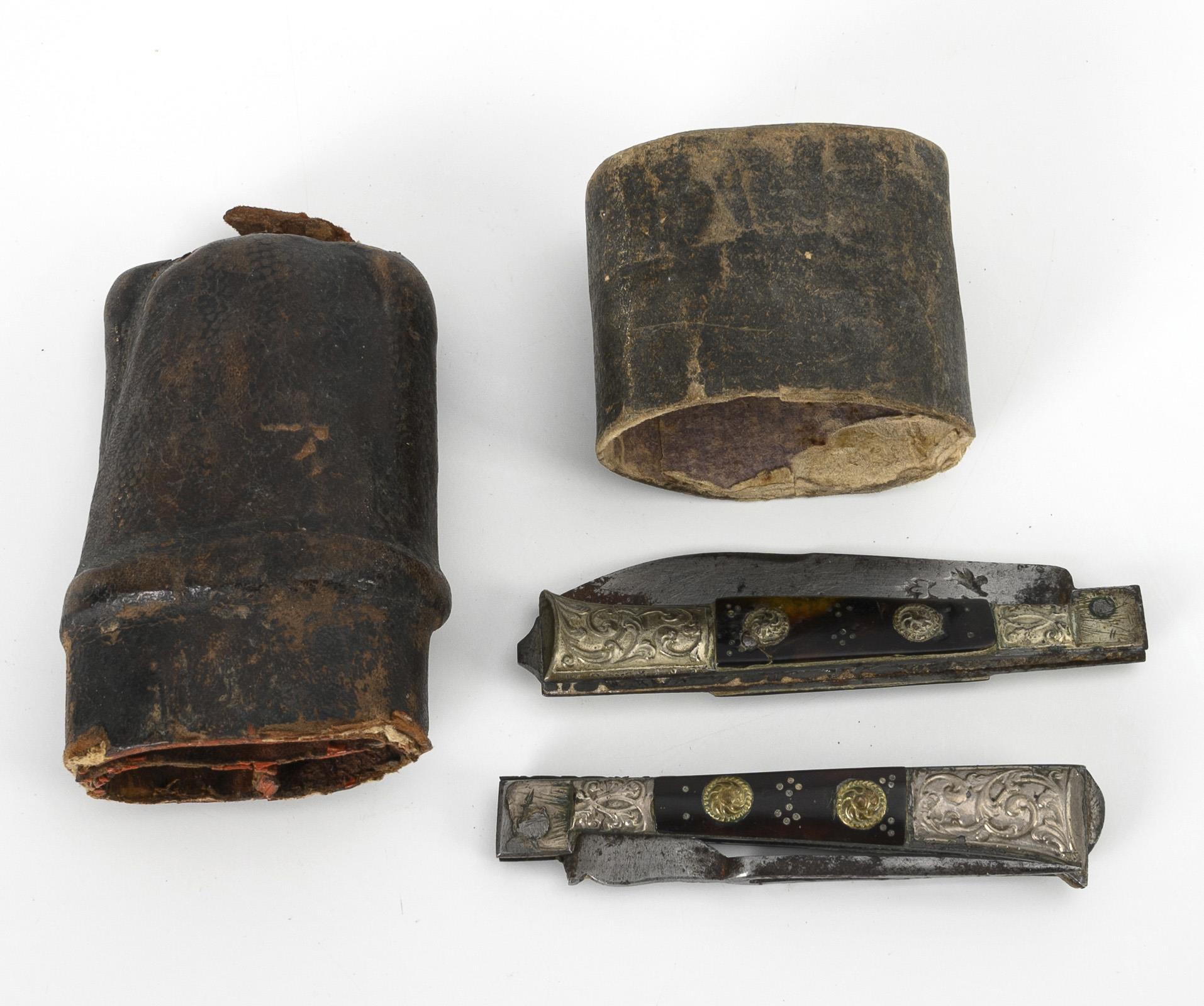 Pappe mit Lederbezug, Eisen, Schildpatt, silberfarbenes Metall / Eisen, Obstholz, Messingmanschetten. L Lederetui 9,5 cm, L Messer aufgeklappt 15 cm. / L zusammengesteckt 20 cm, L Messer 19 cm.