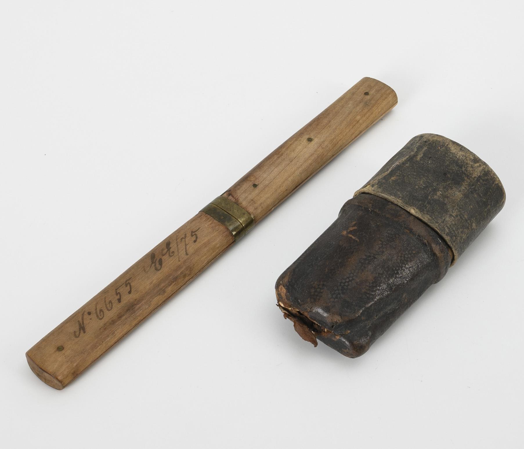 Lederetui mit Passdeckel und Resten einer Schlangenhautpunzierung; innen 3 Fächer. Kleines Klappbesteck (Messer und Gabel) mit Horn-Heftschalen und vegetabil reliefierten Beschlägen. / Gegenseitig in die Holzhefte eingeschobenes Besteck. Auf dem Holz handgeschriebene Nr. von dem Handelshaus Adolph Fuchs in Schmalkalden. Barockes Besteck mit Alters-/Gebrauchsspuren. / 1 Holzgriff mit geringem Abplatzer.