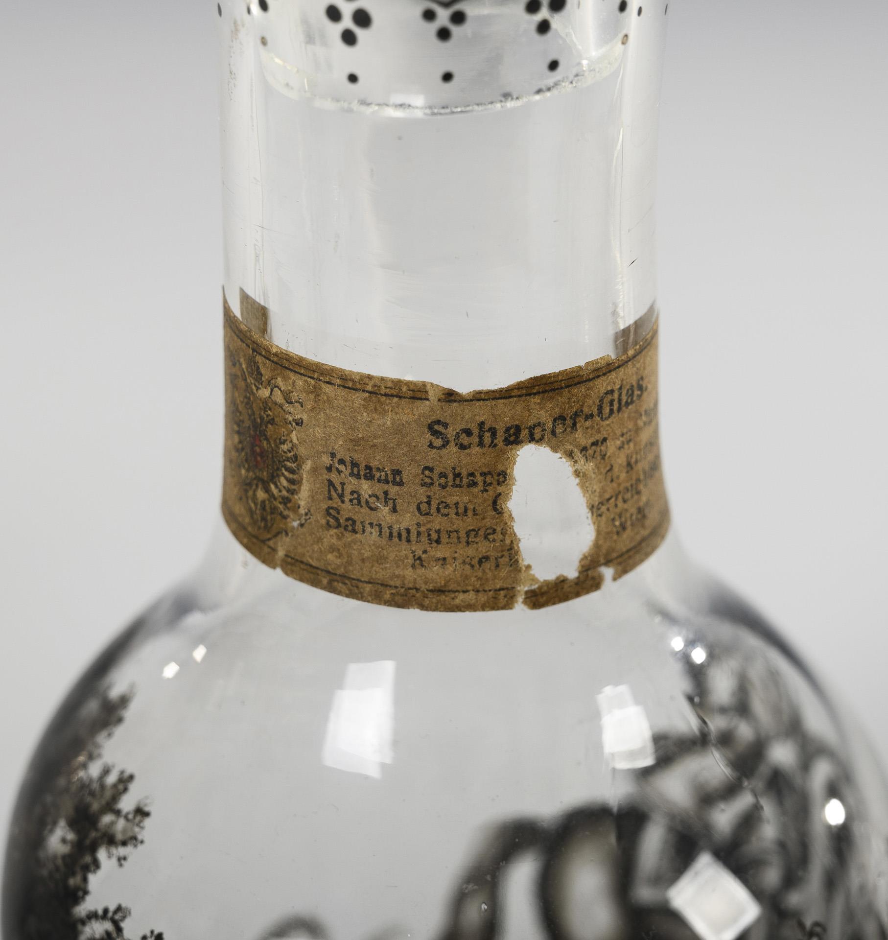 Zylindrische Karaffe mit Enghals und Stopfen; Abriss: umlaufend die Darstellung einer Landschaft mit Jagdszene, auf dem Flaschenhals ein Etikett mit der Bezeichnung "Schaper-Glas. Johann Schaper (...) 1670 zu Nürnberg. Nac dem (...) d. kunsthist. Sammlungen (...)terreichischen Kaiserl. (...) Wien.". / 4 Schnapsgläser mit Kraterkuppa, Balusterschaft und Rundfuß: umlaufend die Darstellung einer Landschaft mit spielenden Kindern. Karaffenhenkel fehlt.