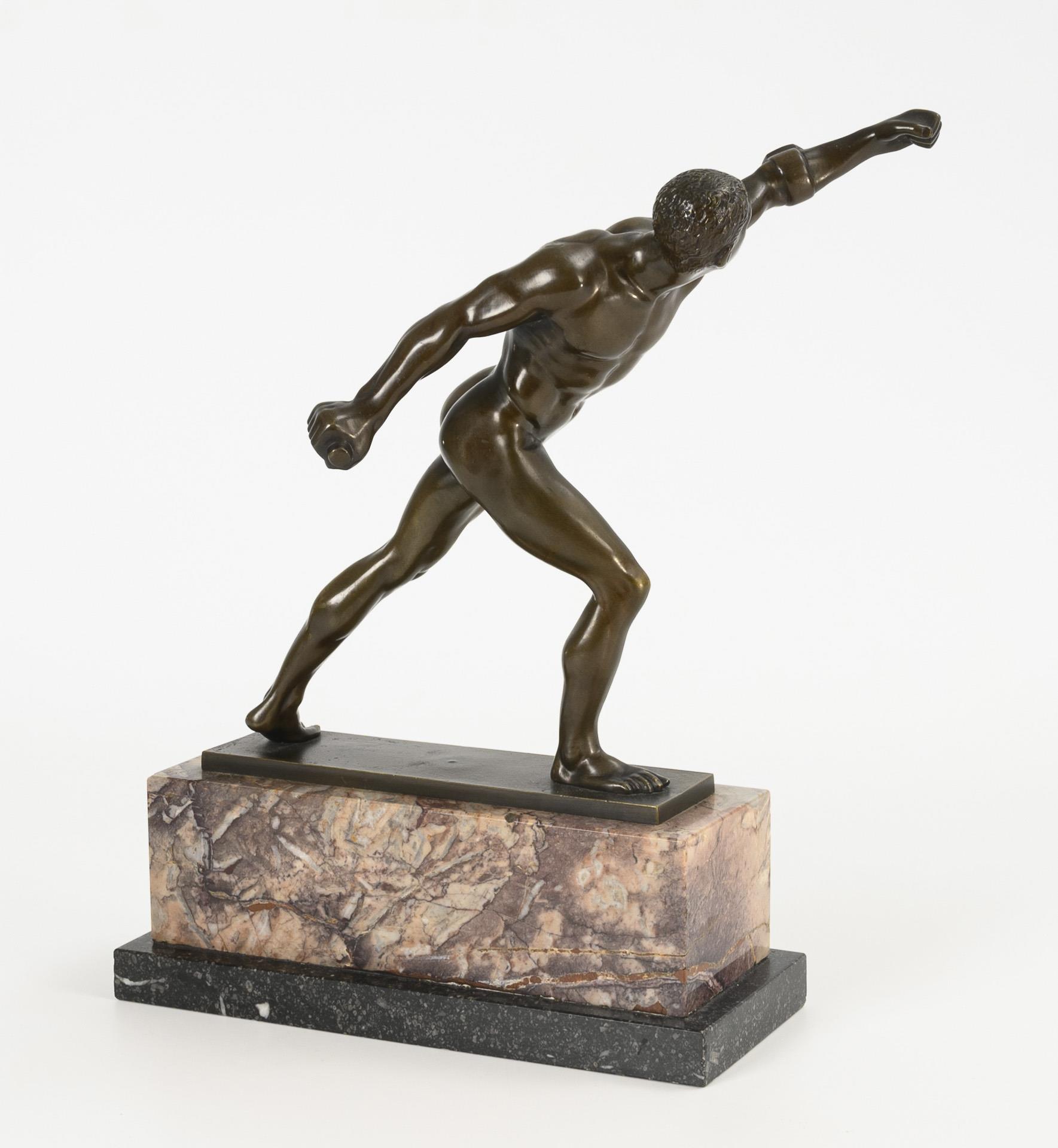Bronze patiniert, rötlicher Marmorsockel auf Diabas-Plinthe. An der Bronze-Plinthe Gießermarke "FWB" (Fuhrmann Wiener Bronze?). H 25 cm, gesamt 33 x 28 x 15 cm. 6,5 kg.