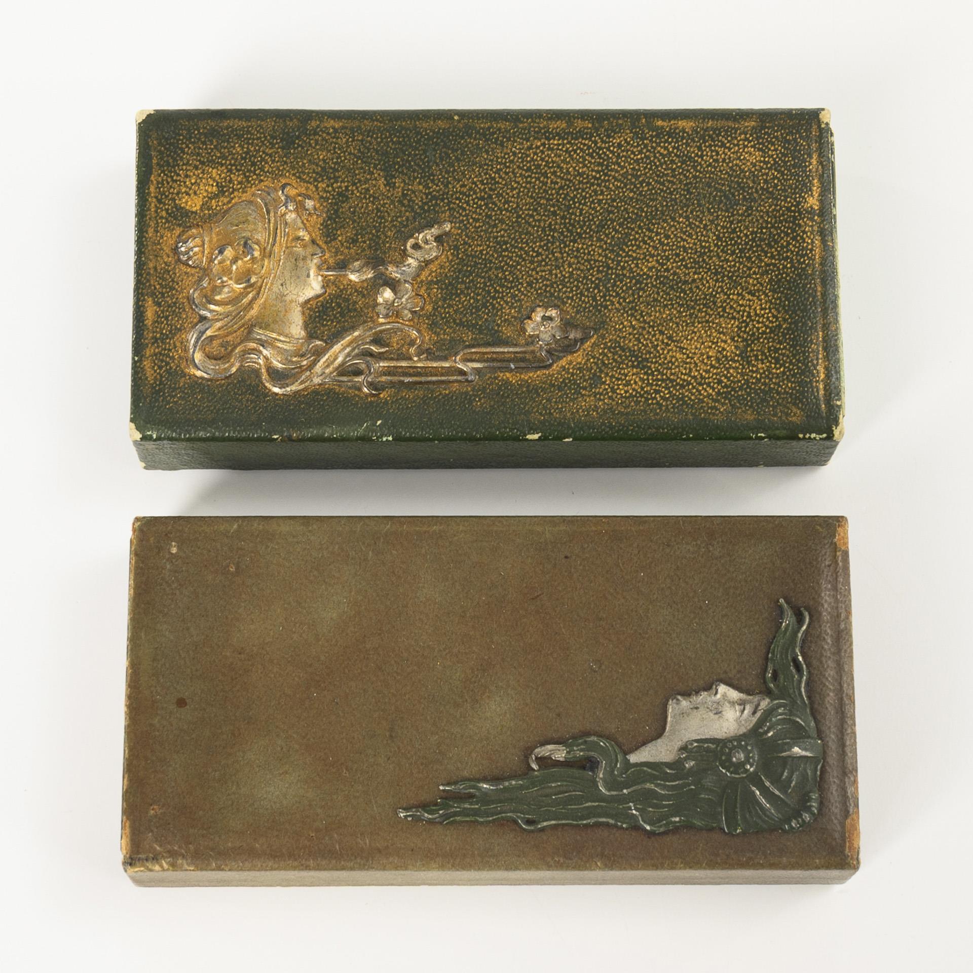 Schubschachteln mit Frauenkopf-Appliken und Reibeflächen an den Stirnseiten. Innen Fachung für Miniatur-Kerzenhalter und -kerzen mit Streichholz-Zündkopf sowie Siegellack. Geringe Alters-/Gebrauchsspuren.