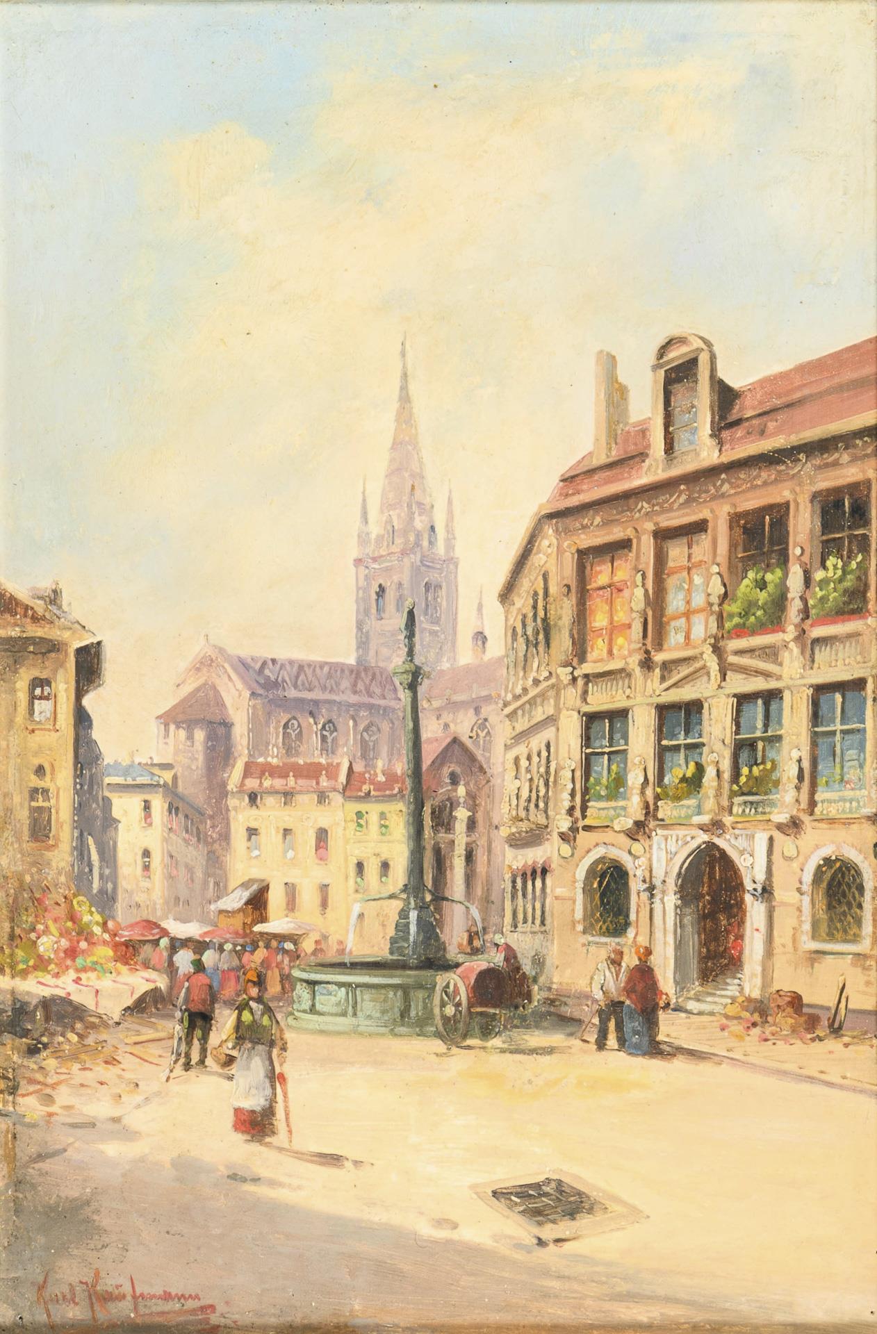 Marktplatz zwischen Altstadthäusern vor einer Kirche im Sonnenschein. Kleine Nadellöcher in zwei Ecken.