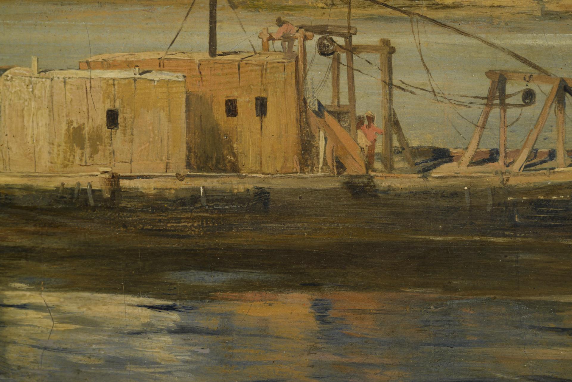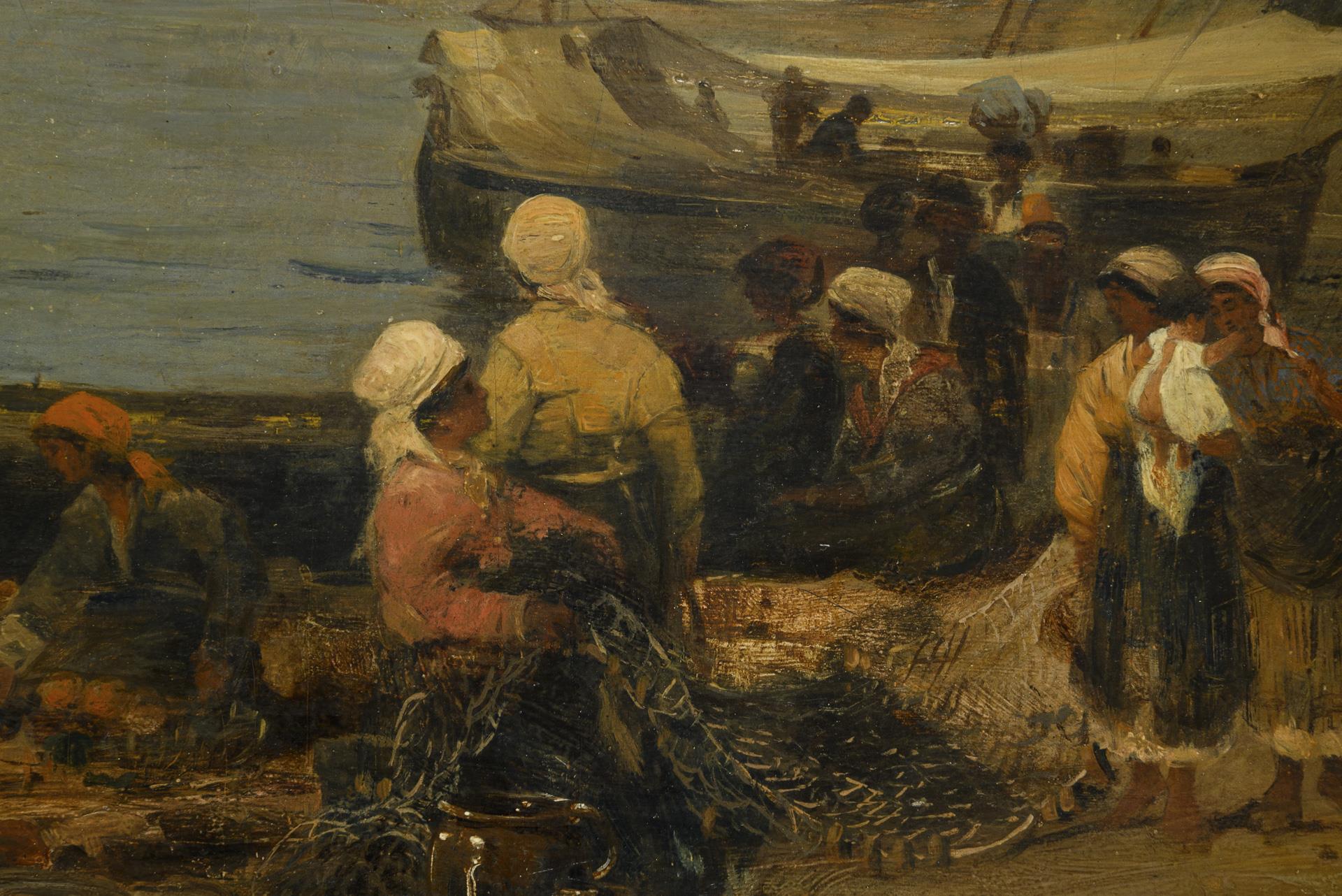 Strandpartie mit Fischerleuten bei den Booten vor der Stadt unter bedecktem Himmel. Leinwand doubliert.