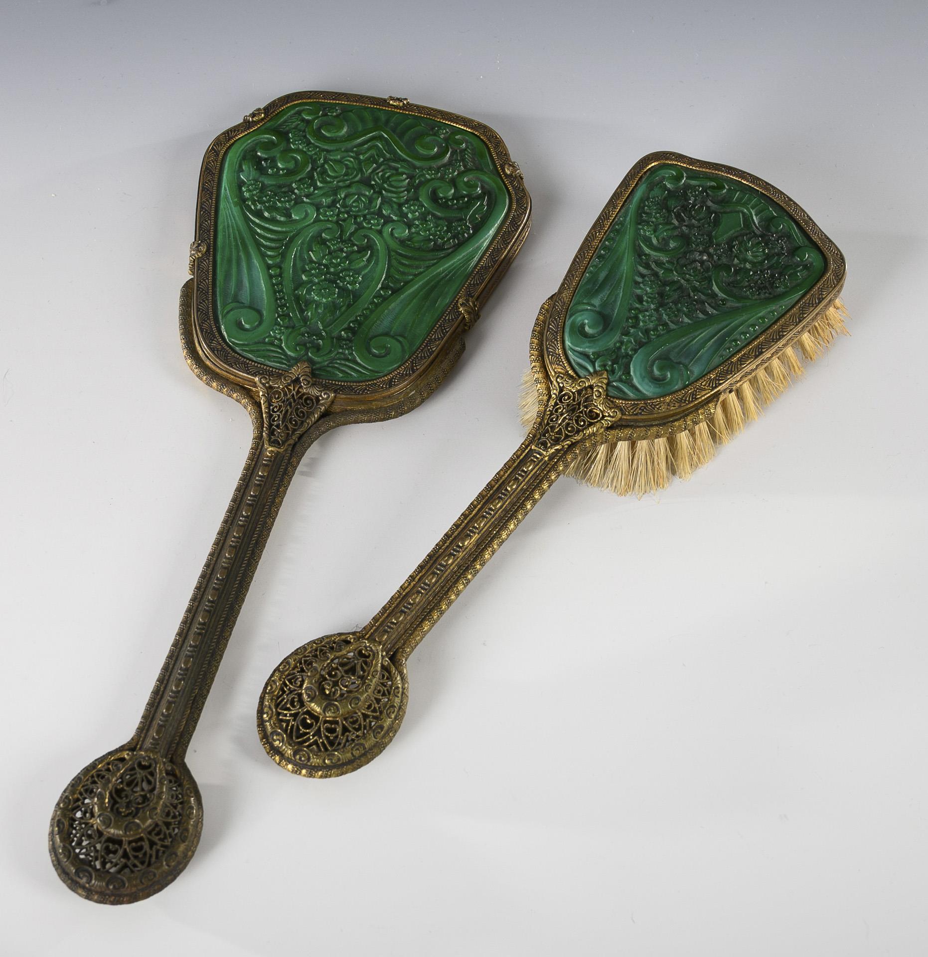 Kammschale (L 22 cm), Seifenschale (L 12,5 cm), Zigarrenascher (Ø 11,5 cm), 2 Flakons (H 10 und 17 cm), 1 Dose (Ø 10 cm), 1 Handspiegel (L 31 cm) und 1 Bürste (L 25 cm). Bestoßungen am Innenrand der Dose.