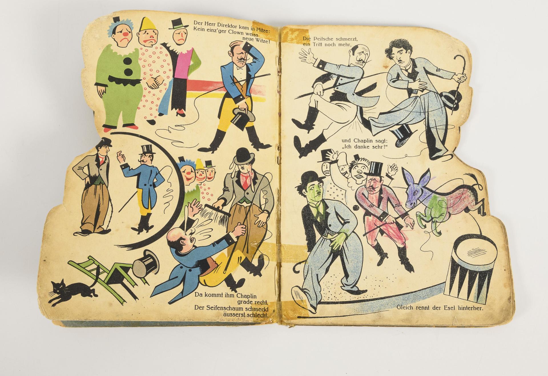 Silhouettenbuch, Verlags-Buchnummer 392. 16 Seiten mit Hartpappeinband. "Alle Bilder sind dem Film Charlie Chaplin in 'Zirkus' mit Erlaubnis der United Artists-Film Verleih GmbH entnommen.". Stärkere Alters- und Gebrauchsspuren mit Kinderkritzeleien, Rücken geklebt.
