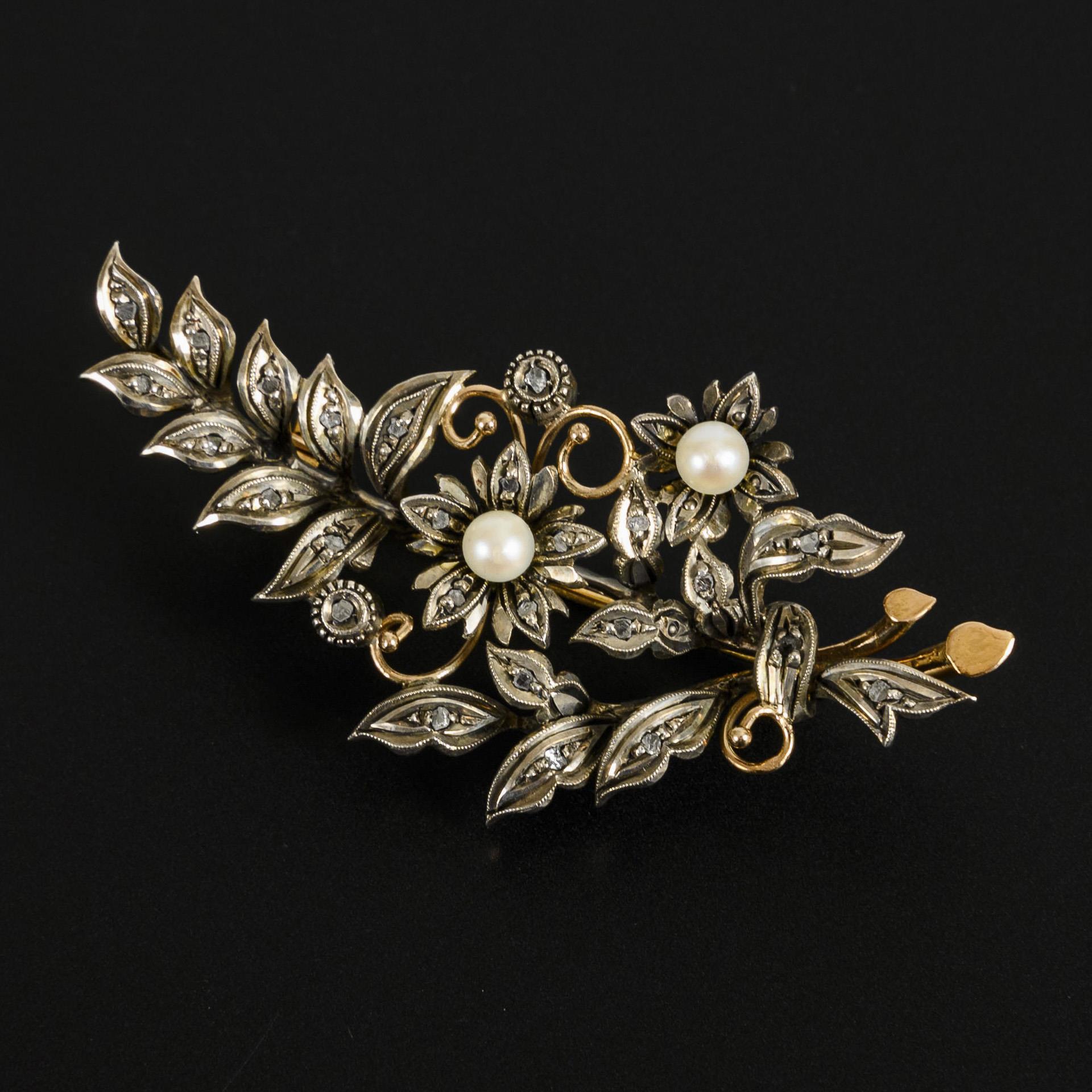 Plastisch gestalteter Blütenzweig, besetzt mit 2 Zuchtperlen und 25 Diamantsplittern. Kugelhaken. 1 Diamantsplitter fehlt.
