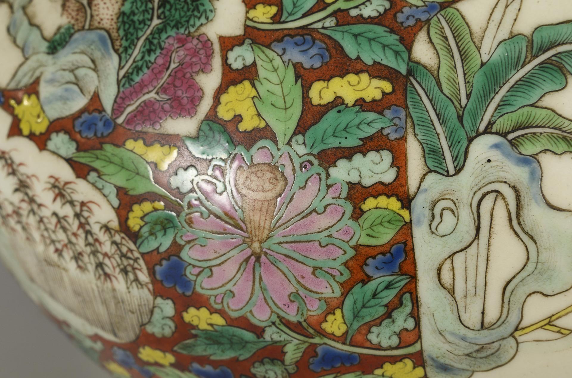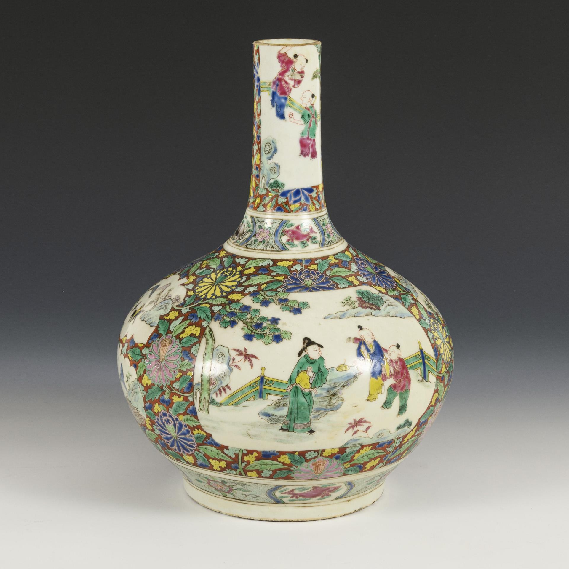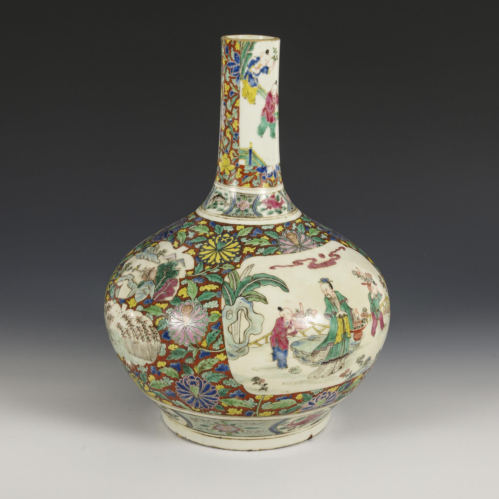 Hochwertige Balustervase mit figürlichen Bildkartuschen zwischen feinem Blumenornament. 'Spinne' am Boden, oberer Rand gekürzt und beschliffen, alter Chip am Bodenrand.