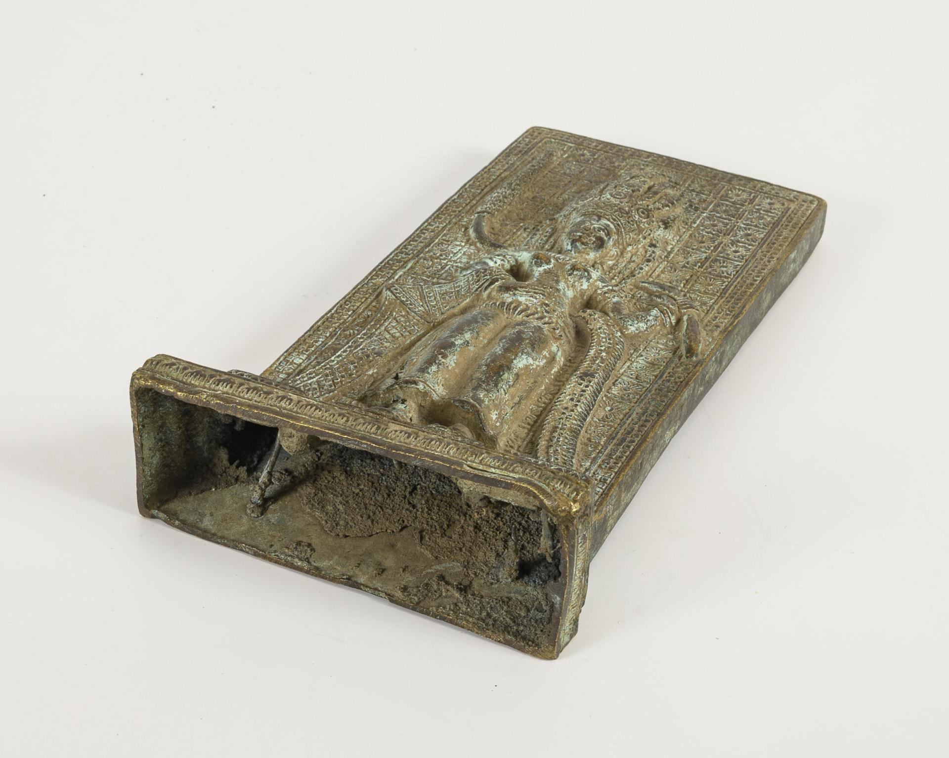 Apsara mit einem Blütenstengel in der Hand. Auf einem angedeuteten Podest stehend. Relief innen hohl, Rückseite glatt.