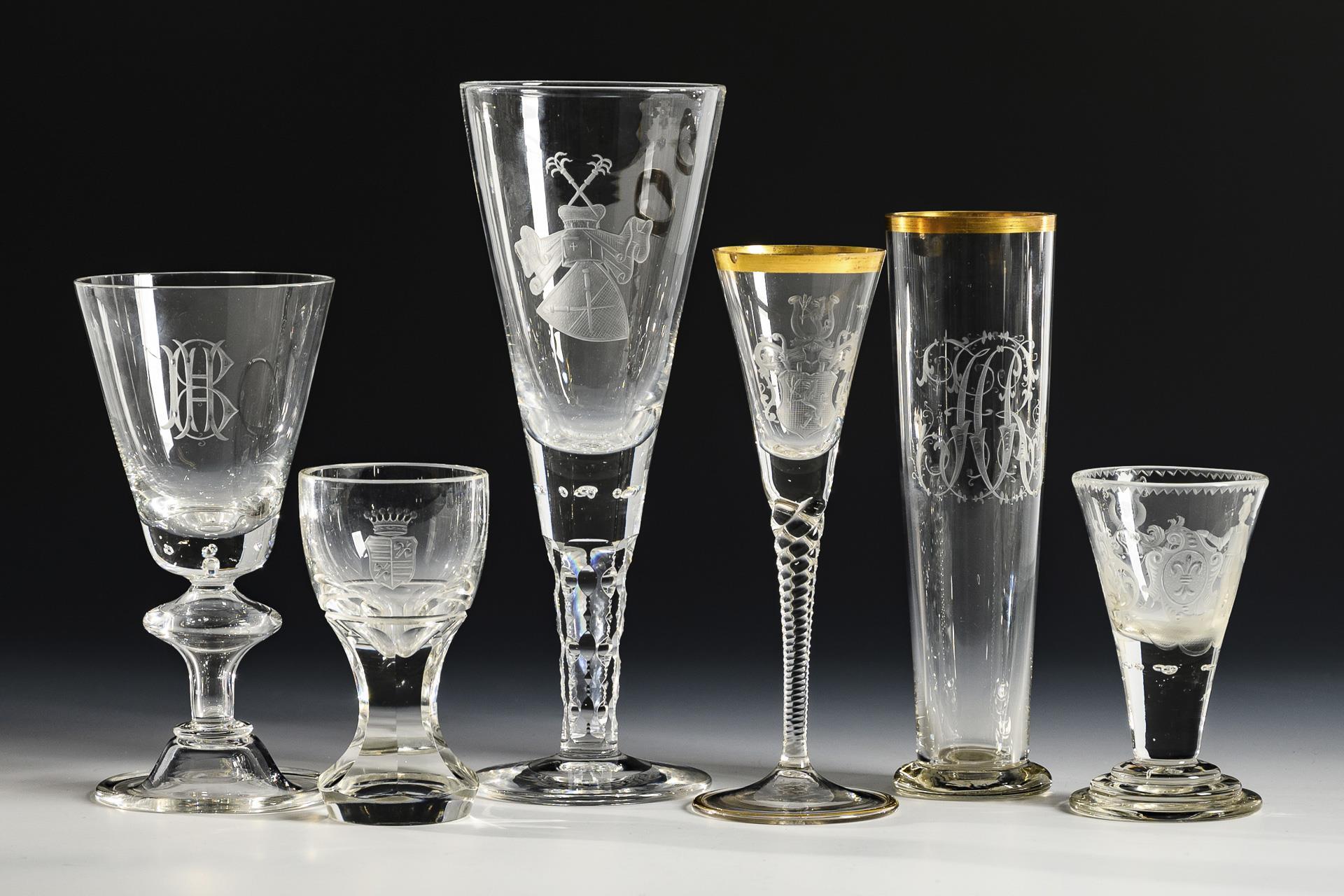 4x mit Wappenschliff: konischer Pokal (H 28,5 cm), konisches Kelchglas mit gedrehtem Schaft (H 22 cm), Römerkanone (H 14 cm) und Kelchglas mit getrepptem Rundfuß (H 13,5 cm). / 2x mit Monogramm: Bierstange mit dem Monogramm "ICR" (H 23 cm) und Kelchglas mit Monogramm (H 20,5 cm). 1x mit Randchip.