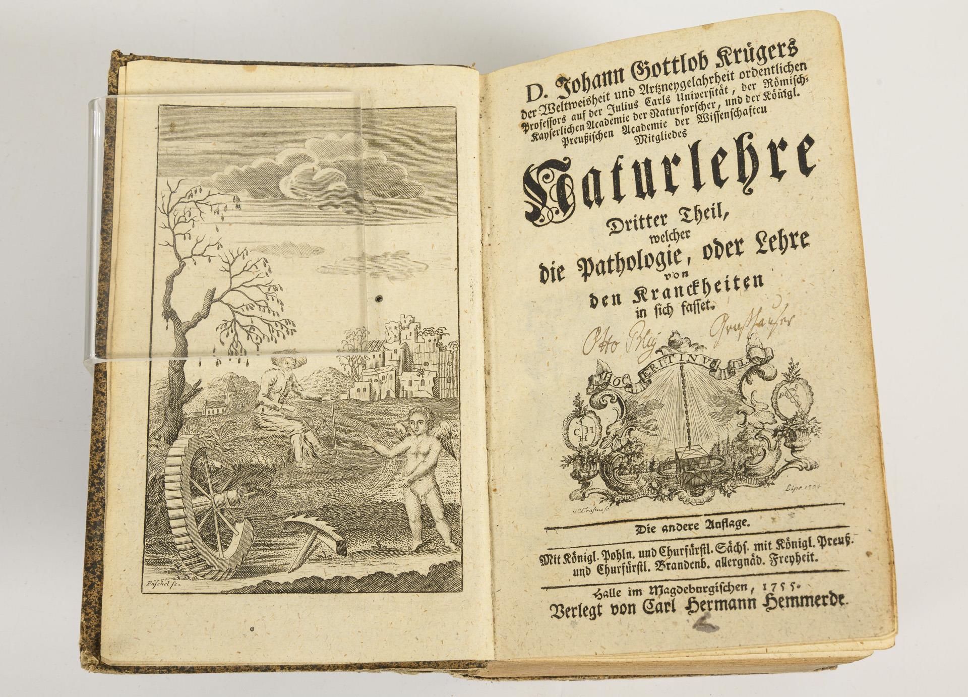 "Zweyter Theil, welcher die Physiologie, oder Lehre von dem Leben und der Gesundheit der Menschen in sich fasset" (50), 826, (78) Seiten und 18 Tafeln. / "Dritter Theil welcher die Pathologie, oder Lehre von den Kranckheiten in sich fasset" (12), 432, (29) Seiten. / "Dritter Theil welcher die besondere Pathologie enthält". (14), 733, (51) Seiten. Beide im Pappeinband der Zeit