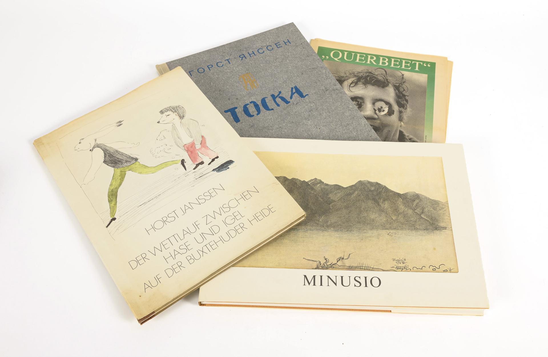 "Der Wettlauf zwischen Hase und Igel auf der Buxtehuder Heide", Faksimileausgabe des Originals, 1973, (42 x 30 cm)., Altersspuren. / "Minusio", Verlag Ullstein, 1973, im Leineneinband mit Schutzumschlag und Schuber, (31,5 x 44 cm). / "Toska", Buchausgabe in kyrilischer Schrift, Arkana Verlag 1981, Göttingen. Halbleineneinband, (42,5 x 30,5 cm). / 2x "Querbeet", Sonderdruck des Hamburger Abendblattes zum 70. Geburtstag von Horst Janssen, anläßlich der Ausstellung ... 1999", 8 Seiten ( 40 x 28,5 cm).