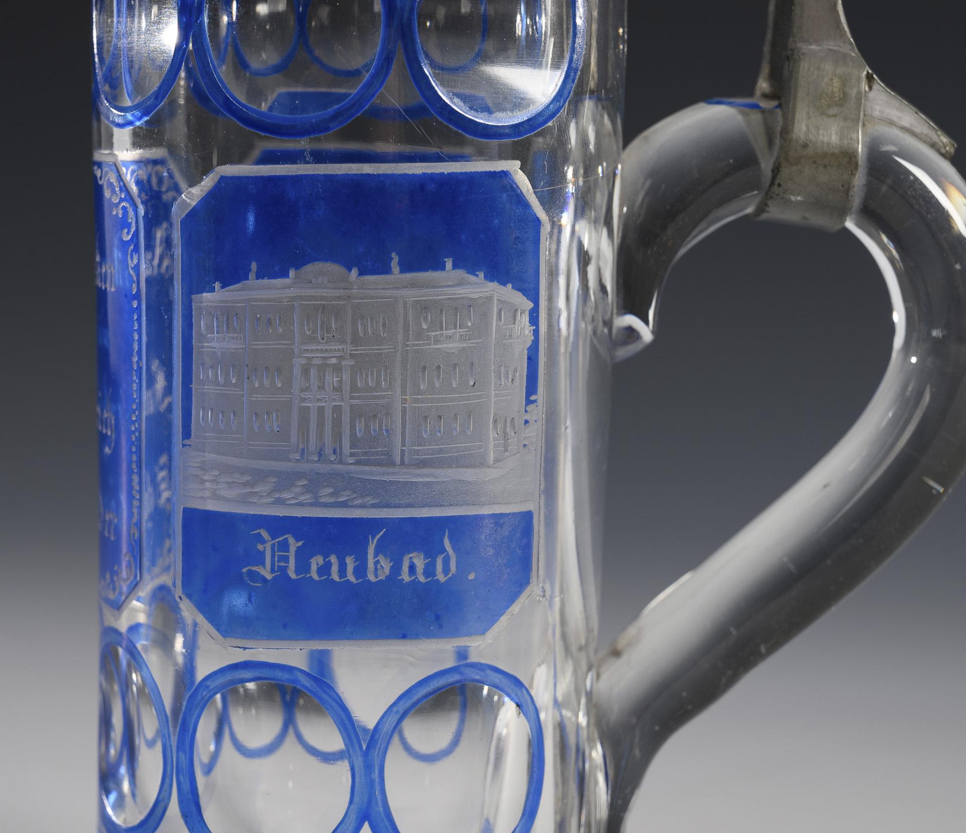1x kleiner Walzenkrug aus farblosem, blau lasiertem Glas mit zinngefasstem Glasdeckel und einem Ziegenbock als Drücker; mit Linsenschliff und zwei gravierten Ansichten von Teplitz (H 23 cm). / 1x Kugelbecher/Scherzbecher aus farblosem Glas mit Kerb- und Linsenschliff, mit dem Spruch "Trink mich aus / leg mich nieder / Steh ich auf / füll mich wieder" (H 7 cm). Kleine Bestoßungen am Rand des Bechers.