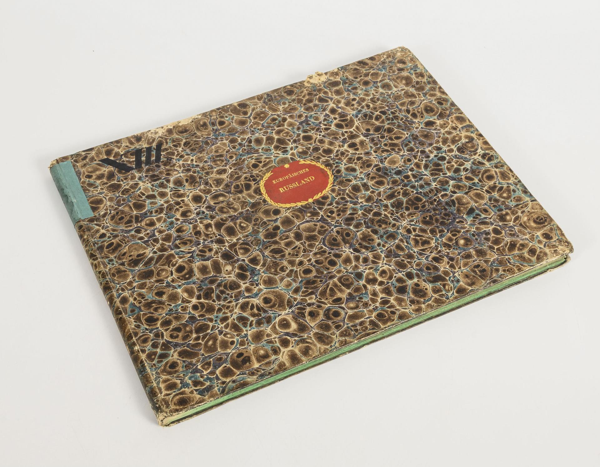 Titelblatt, 29 Textseiten, 25 Tafeln mit Grenzkolorierungen. Inklusive der seltenen Karte "Das Russische Amerika". Im Pappeinband der Zeit mit Goldprägung und Grünschnitt. Nur schwache Altersspuren.