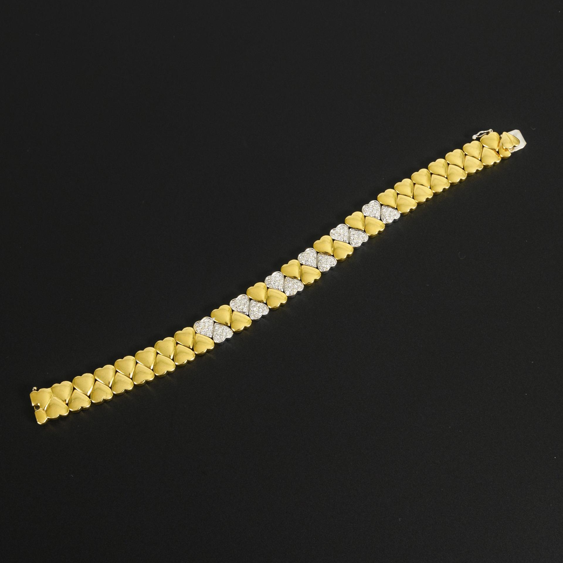 Hochwertig gearbeitetes Bicolor-Armband mit doppelreihigen Gliedern in Herzform, von diesen 12 in Weißgold mit pavégefassten, kleinen Diamanten besetzt. Ca. drei kleine Diamanten fehlen, das Gelbgold mit Tragespuren.