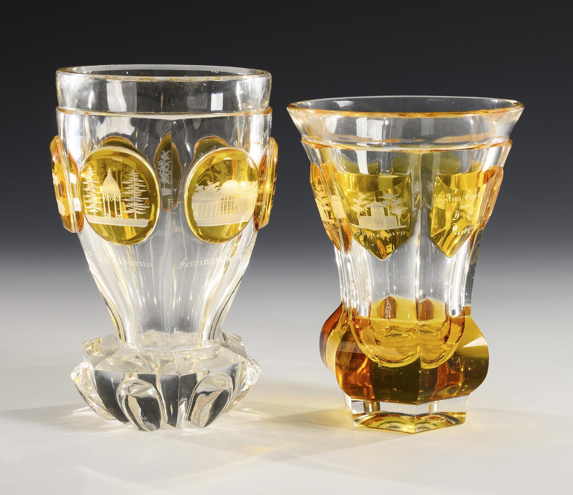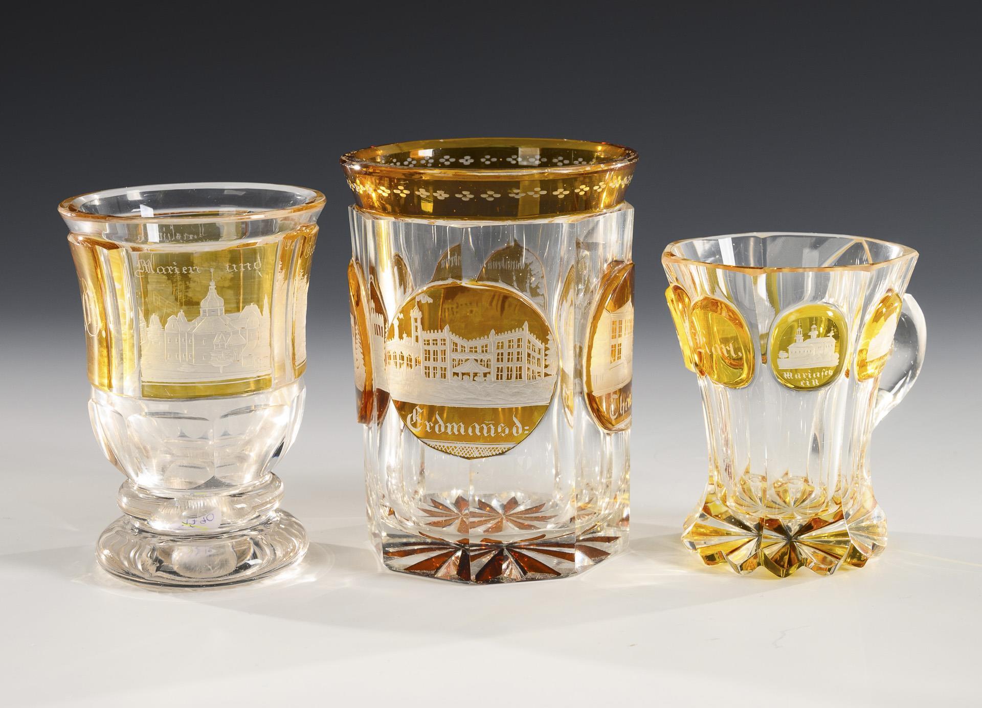 2 Ranftbecher, 1 Zylinderglas, 1 Kelchglas und 1 Henkelbecher mit Schliffdekor und gravierten Ansichten (Teplitz, Marienbad, Kynast, Landeck, Dux). Beschliffene Randbestoßung am Zylinderbecher.