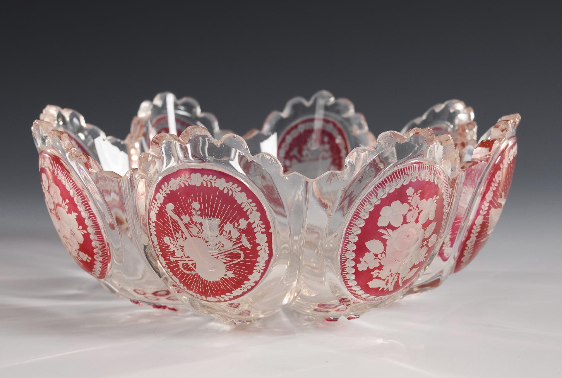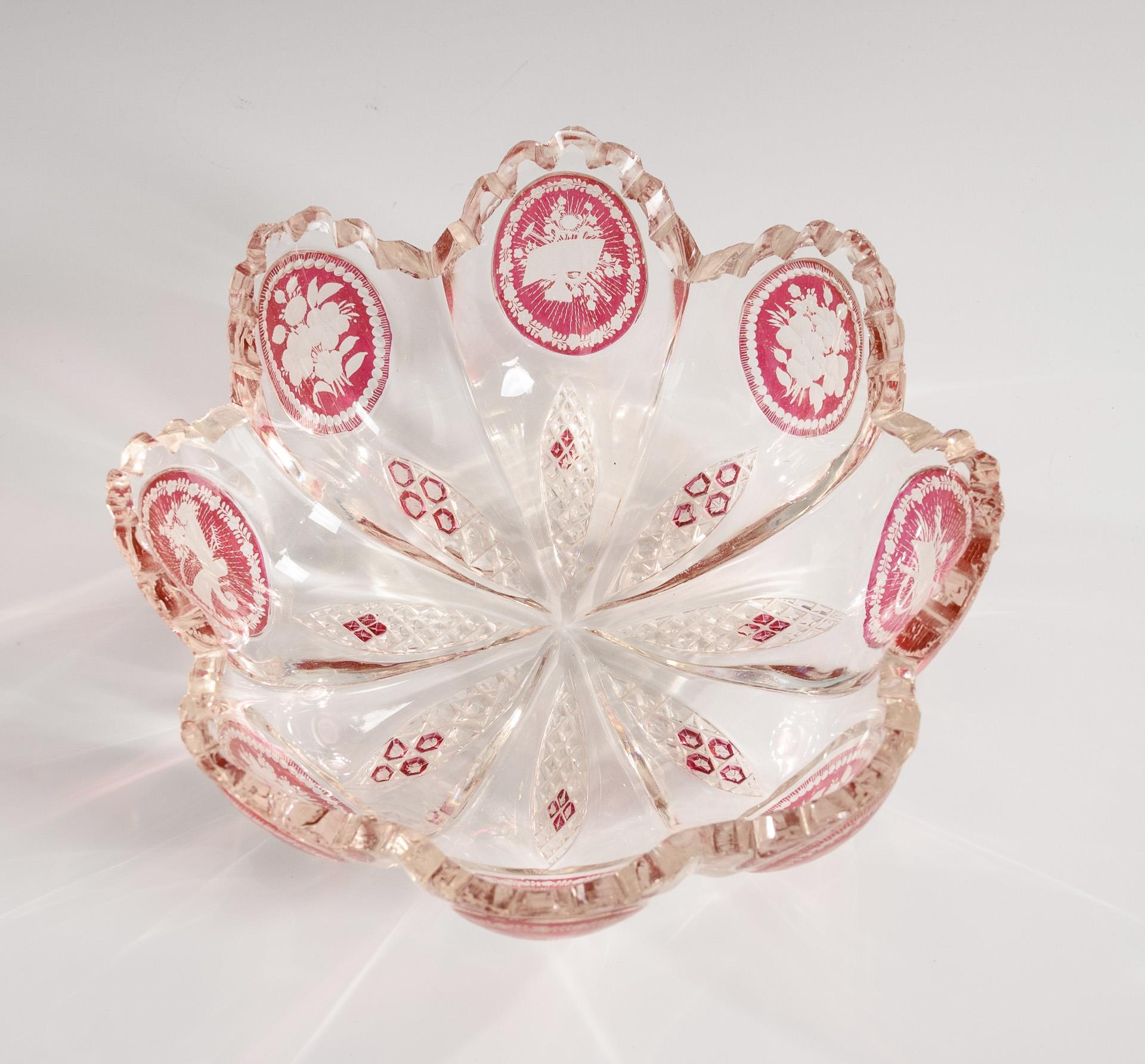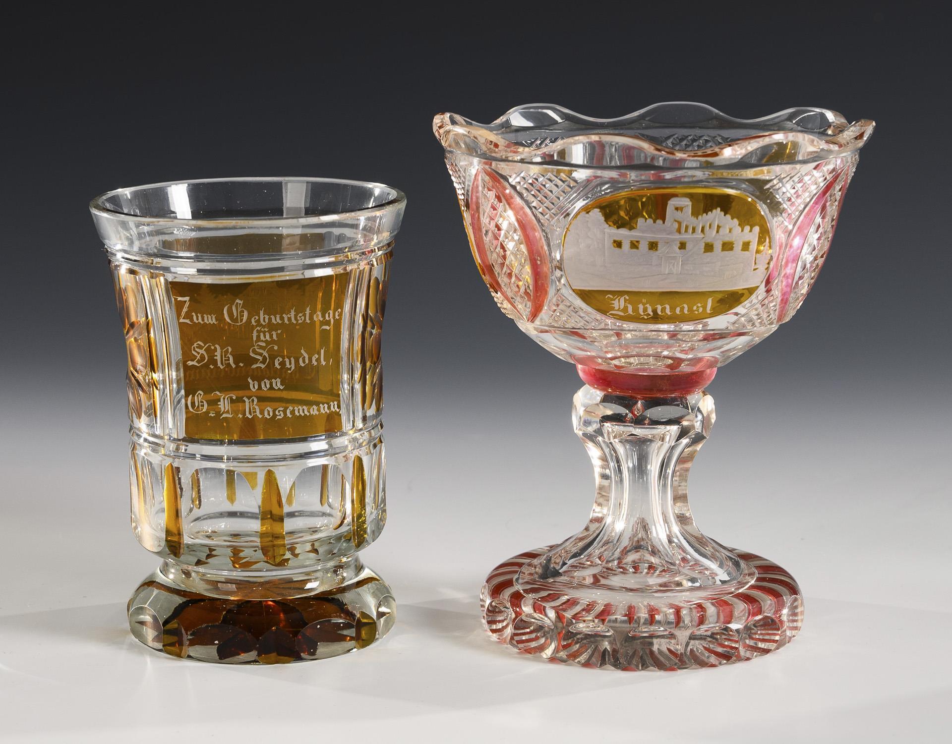 1x achtpassige Schale mit gravierten Blumenbuketts, Symbolarrangements und Steinelschliff (Ø 15 cm). / 1x Fußbecher mit Kerb- und Linsenschliff sowie einer gravierten Ansicht von Charlottenbrunn (H 11,5 cm). / 1x Fußschale mit Kerb- und Steinelschliff sowie drei gravierten Ansichten (Kynast, Warmbrunn, Landhausen; H 13,5 cm). Bestoßungen am Schalenrand und den Füßen der Ansichtengläser.