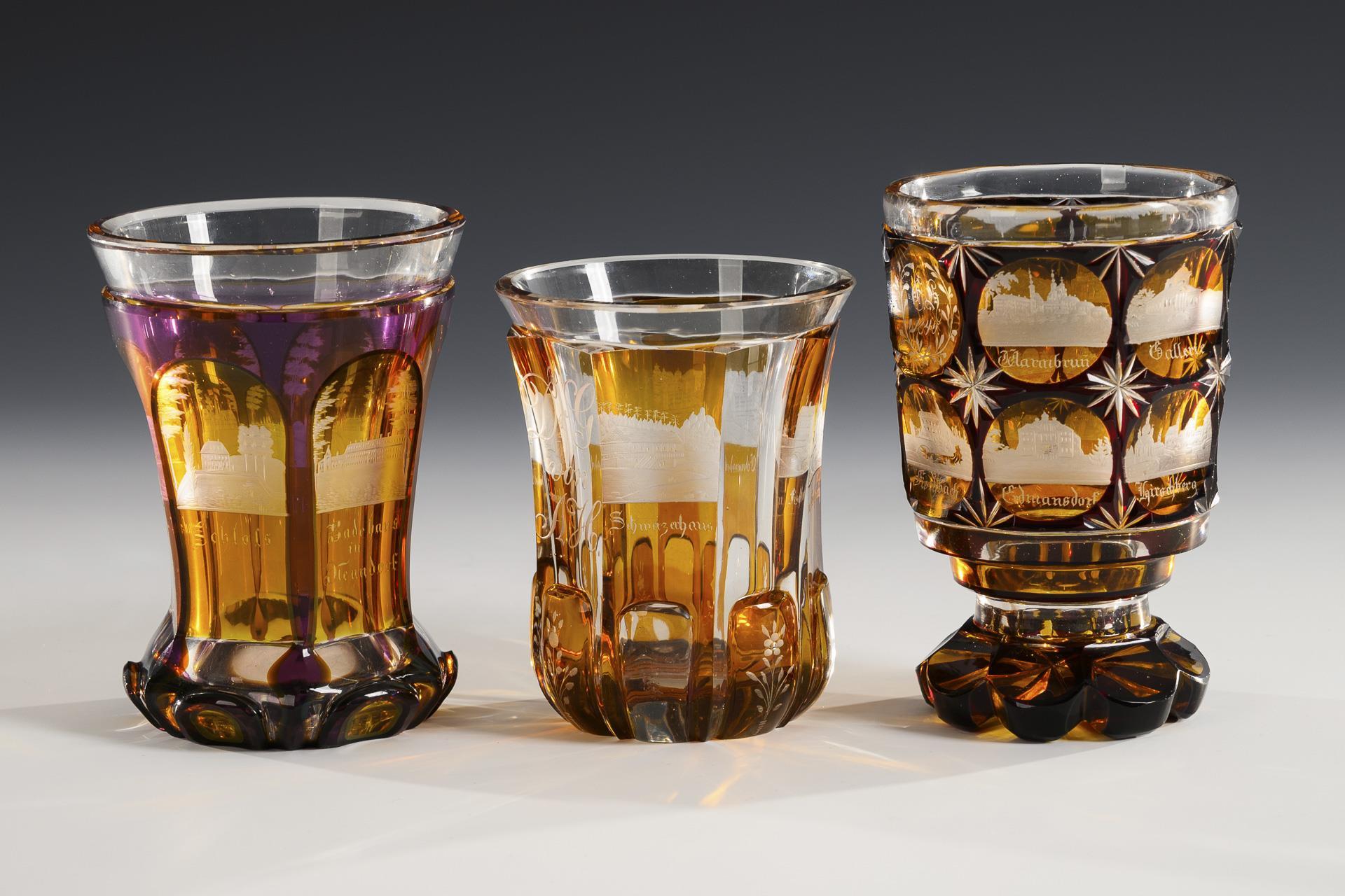 1x Fußbecher aus farblosem Glas mit violettem Überfang, Gelbbeize und gravierten Ansichten von Nenndorf auf geschliffenen Zungen. / 1x Kelchglas aus farblosem Glas mit rubinrotem Überfang, partieller Gelbbeize und gravierten schlesischen Ansichten in geschliffenen Linsen (u.a. Erdmannsdorf, Hirschberg, Fischbach, Warmbrunn, Stonsdorf). / 1x facettierter Becher aus farblosem, teils gelb gebeiztem Glas mit hochgeschliffenen Zungen am Stand sowie gravierten schlesischen Ansichten (Erdmannsdorf, Fischbach, Krummhübel, Schweizerhaus). 1x minimale Bestoßung am Mündungsrand, 1x Bestoßung am Fußrand.