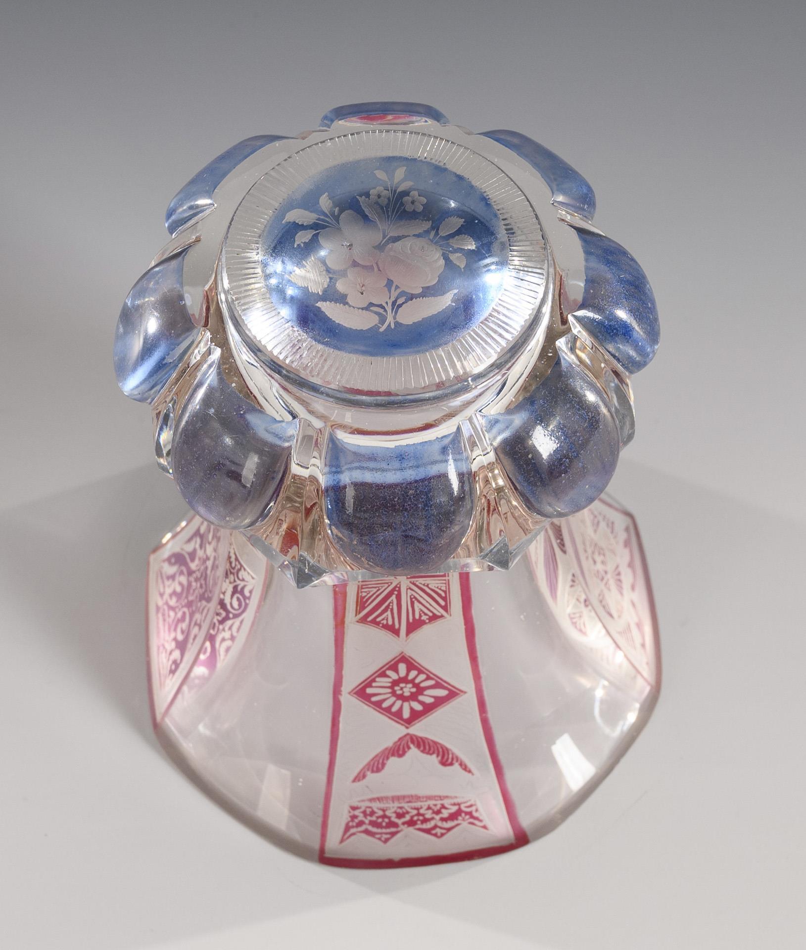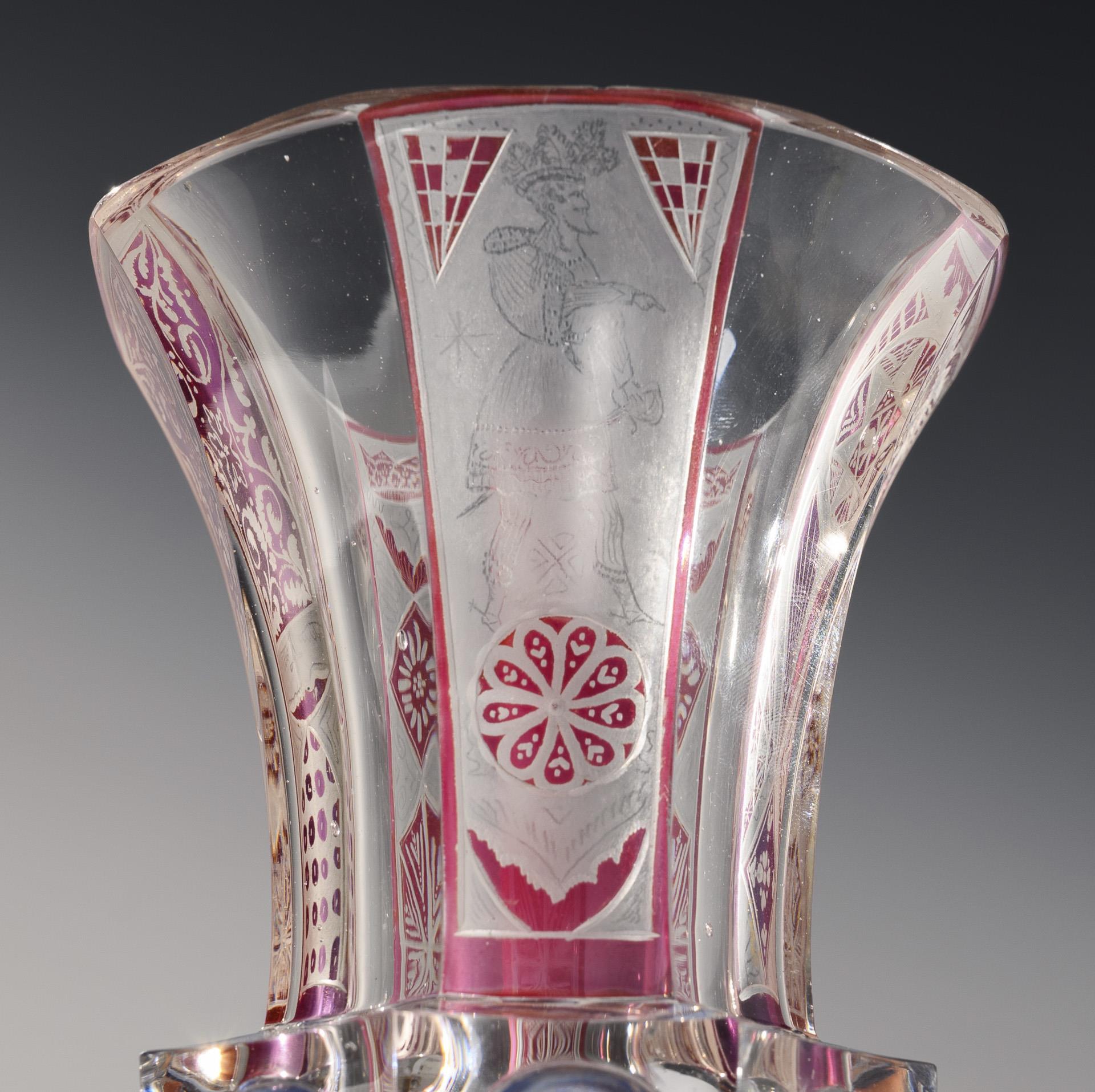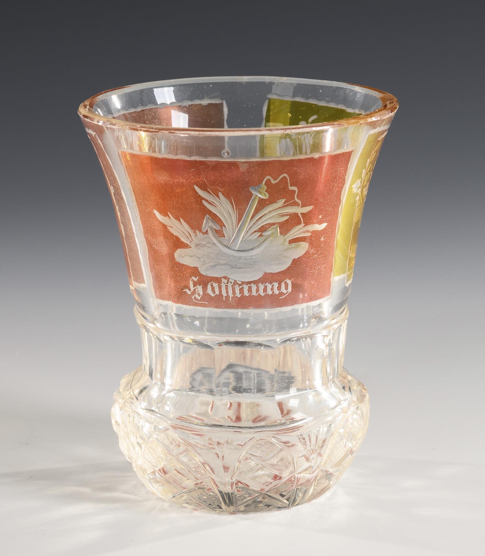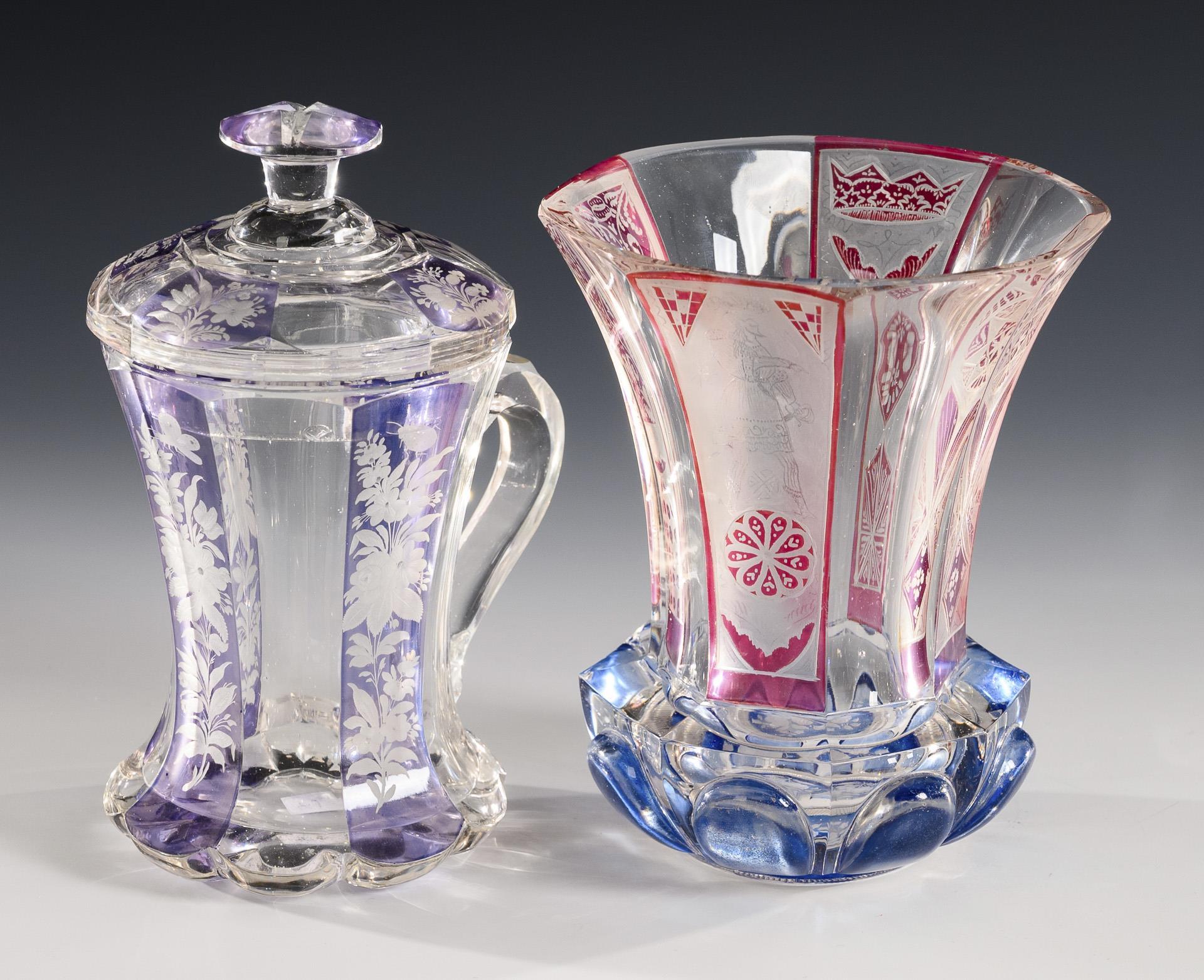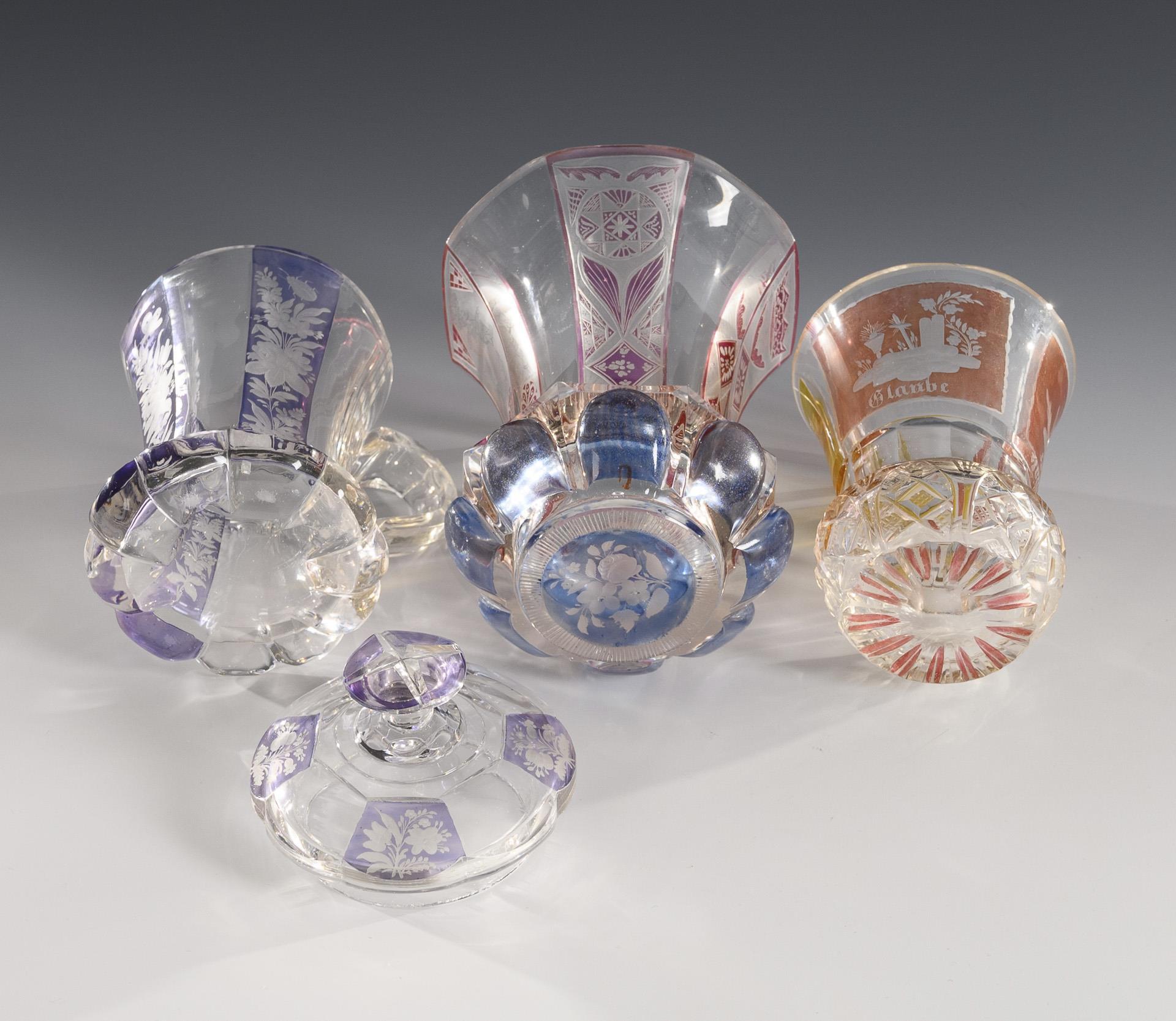 1x facettierter, partiell violett lasierter Henkelbecher mit Knaufdeckel und gravierten Blumenbuketts (H 15,5 cm). / 1x teils gelb bzw. rot lasierter Fußbecher mit Facetten-, Kerb- und Steinelschliff sowie gravierten Symbolarrangements "Glaube, Hoffnung und Liebe" (H 11 cm). / 1x großer, teils rosa und blau lasierter Fußbecher mit facettierter Wandung, hochgeschliffenen Zungen am Stand, gravierten Ornamenten und einer geätzten Darstellung eines Landsknechtes (H 13 cm). Bestoßungen am Innenrand des Deckels, 1x minimale Bestoßung am Mündungsrand.