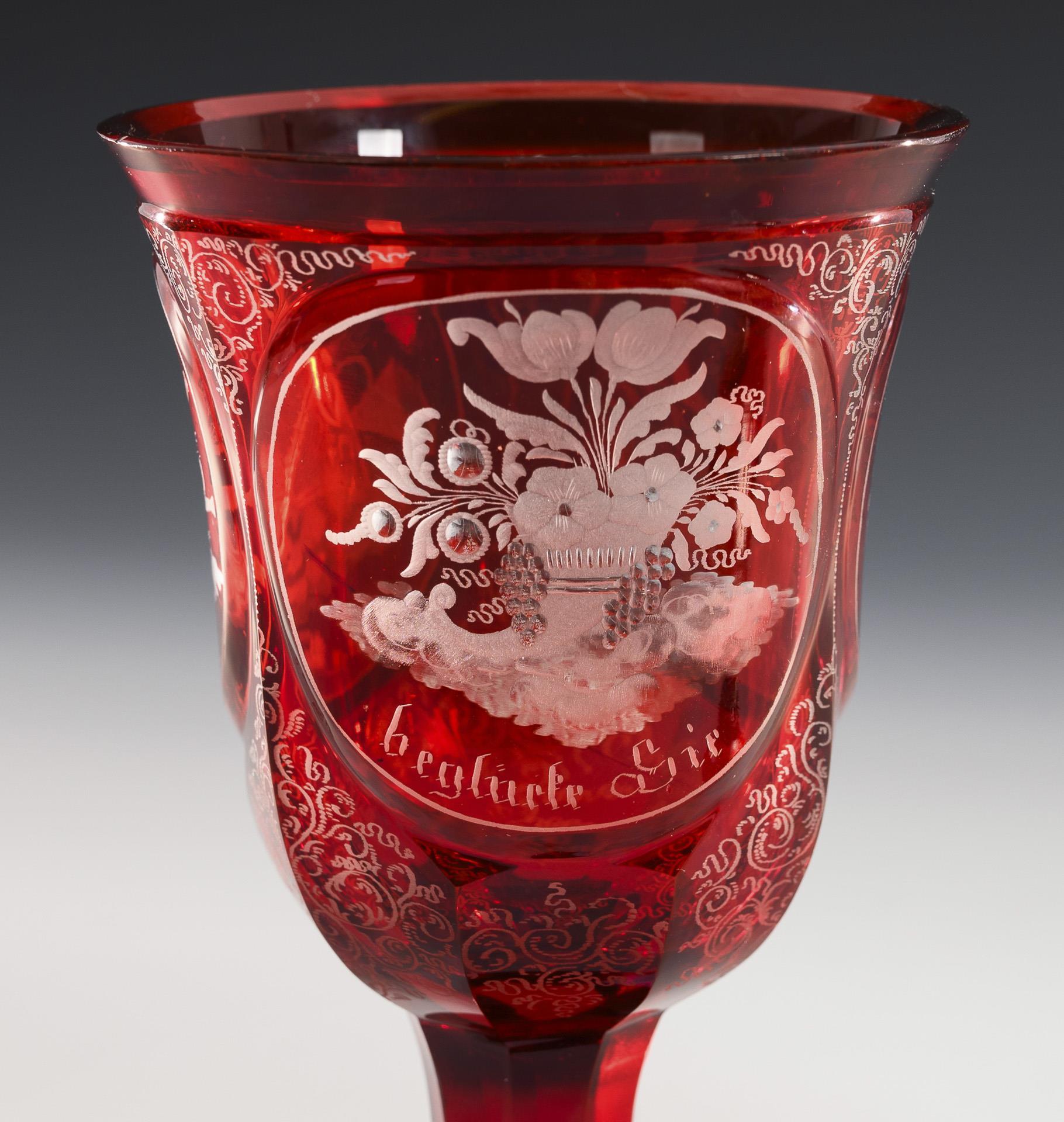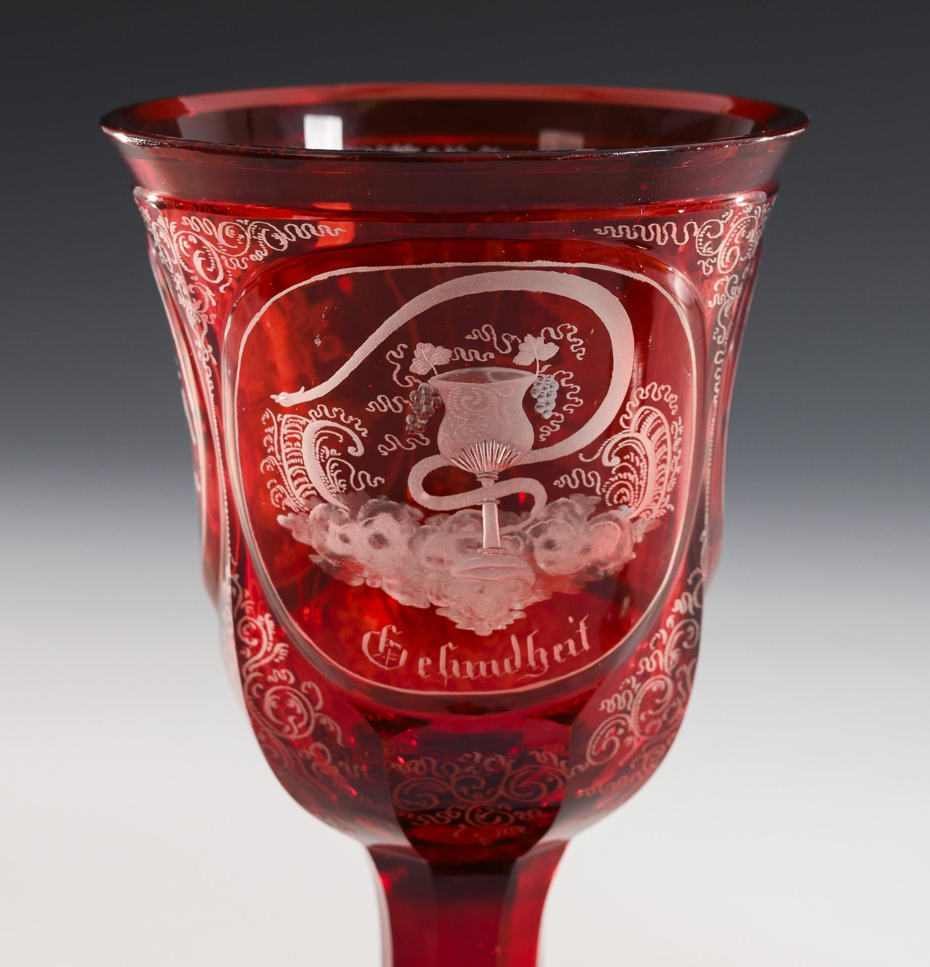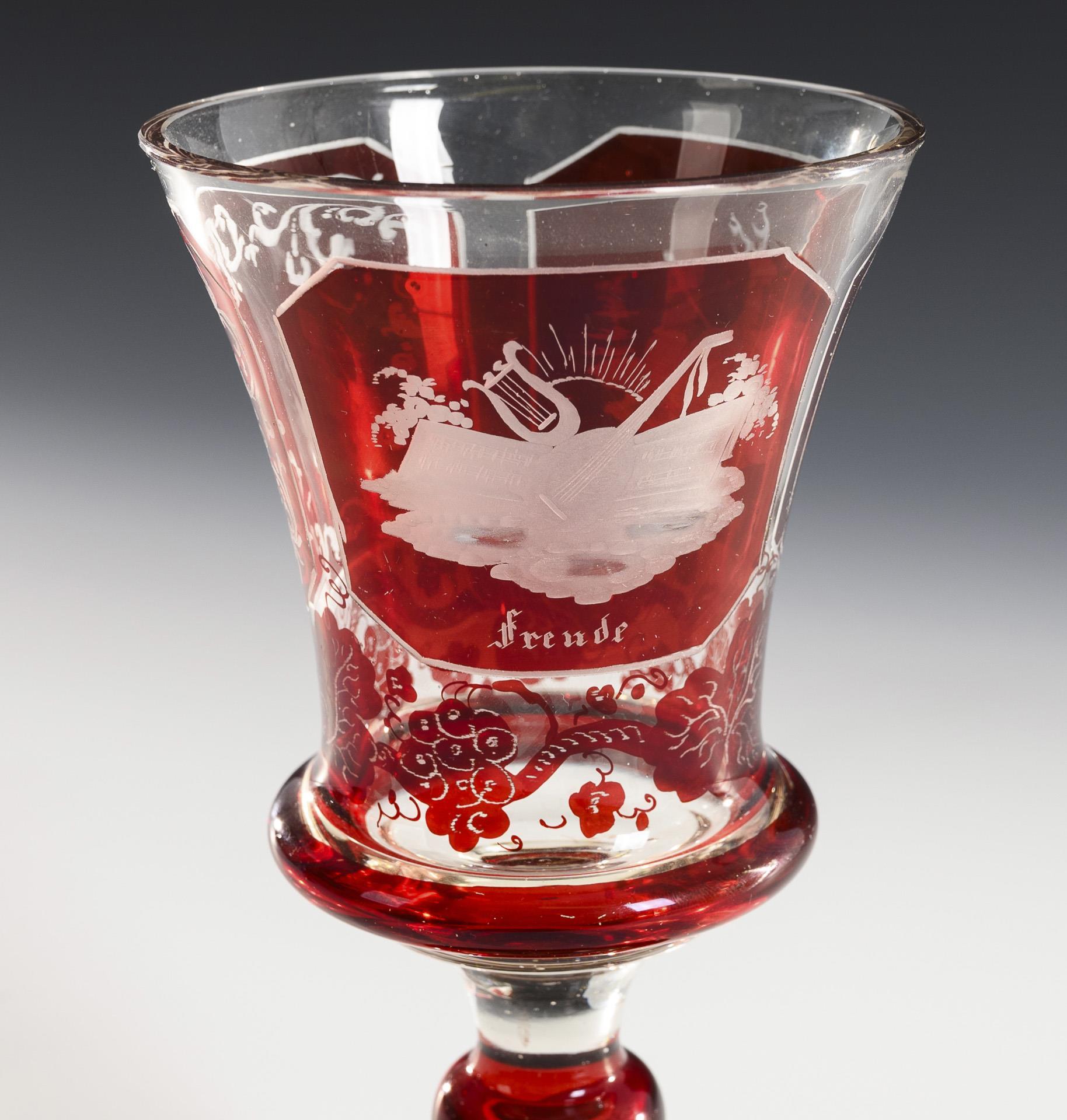 1x Kelchglas mit Kraterkuppa, nodiertem Schaft und Rundfuß: auf der Kuppa zwei gravierte Symbolarrangements, bezeichnet "Freude" und "Vergnügen" sowie gemalte Weinreben (H 21,5 cm). / 1x Kelchglas mit am Ansatz facettierter Glockenkuppa, facettiertem Schaft und mehrpassigem Fuß: auf der Kuppa drei geschliffene Medaillons mit gravierten Symbolarrangements, bezeichnet "Gesundheit u. Frohsinn beglücke sie" (H 17 cm).