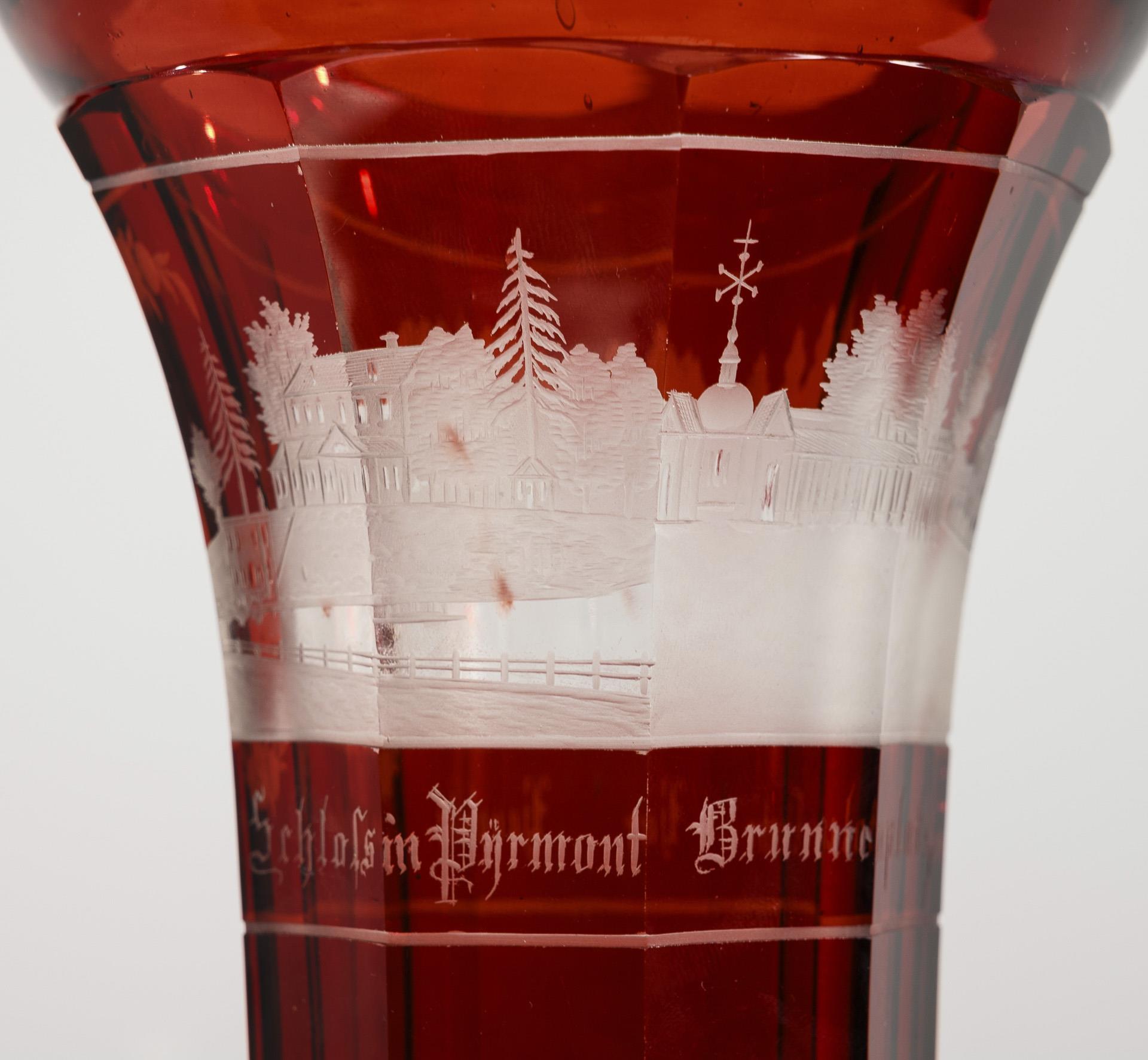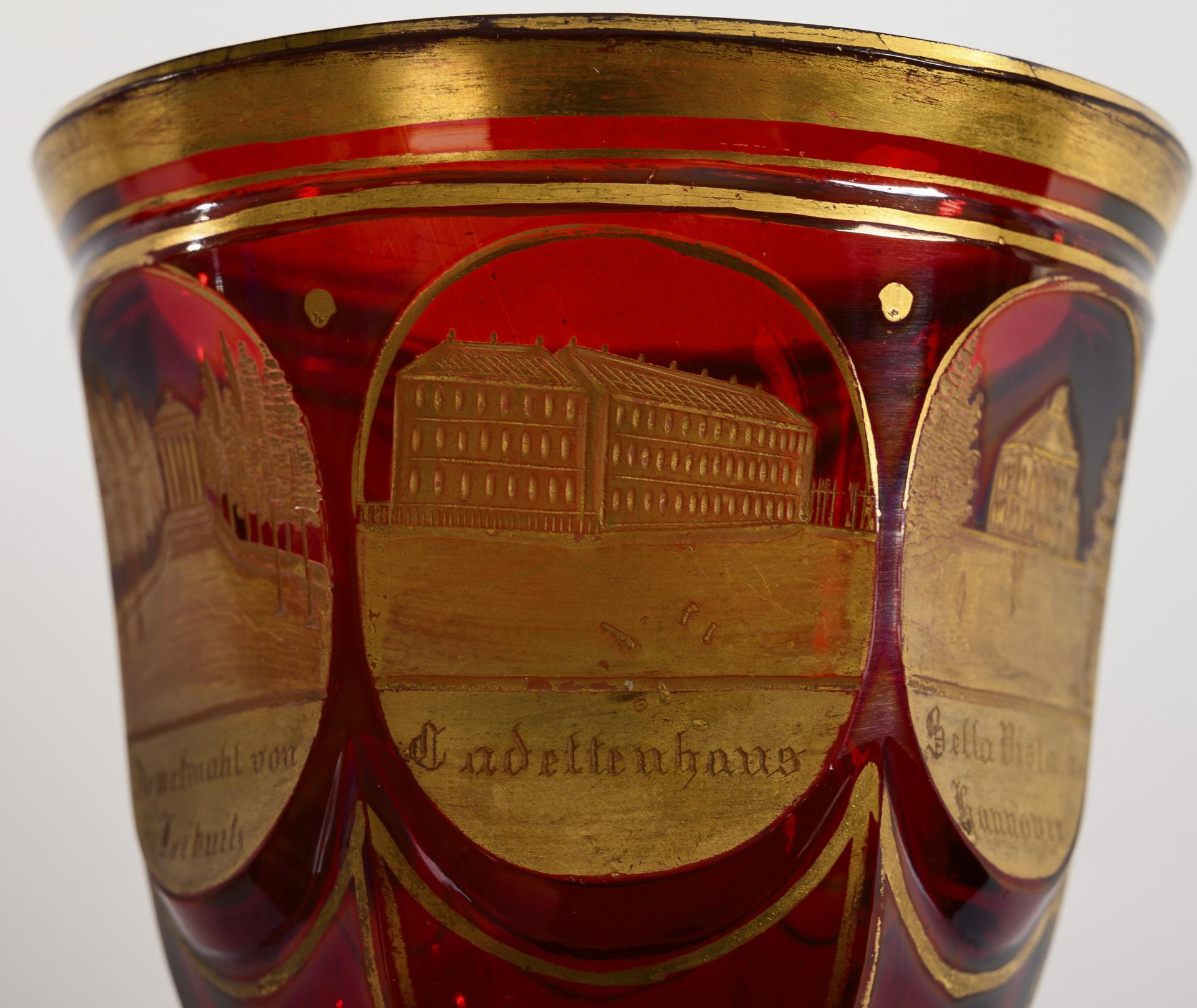 1 Kelchglas und 2 Fußbecher, facettiert mit gravierten Ansichten (2x Hannover, 1x Bad Pyrmont). Gold berieben, 2x mit kleinen Fußbestoßungen, 1 Becher mit Kratzspuren an der Innenwandung.