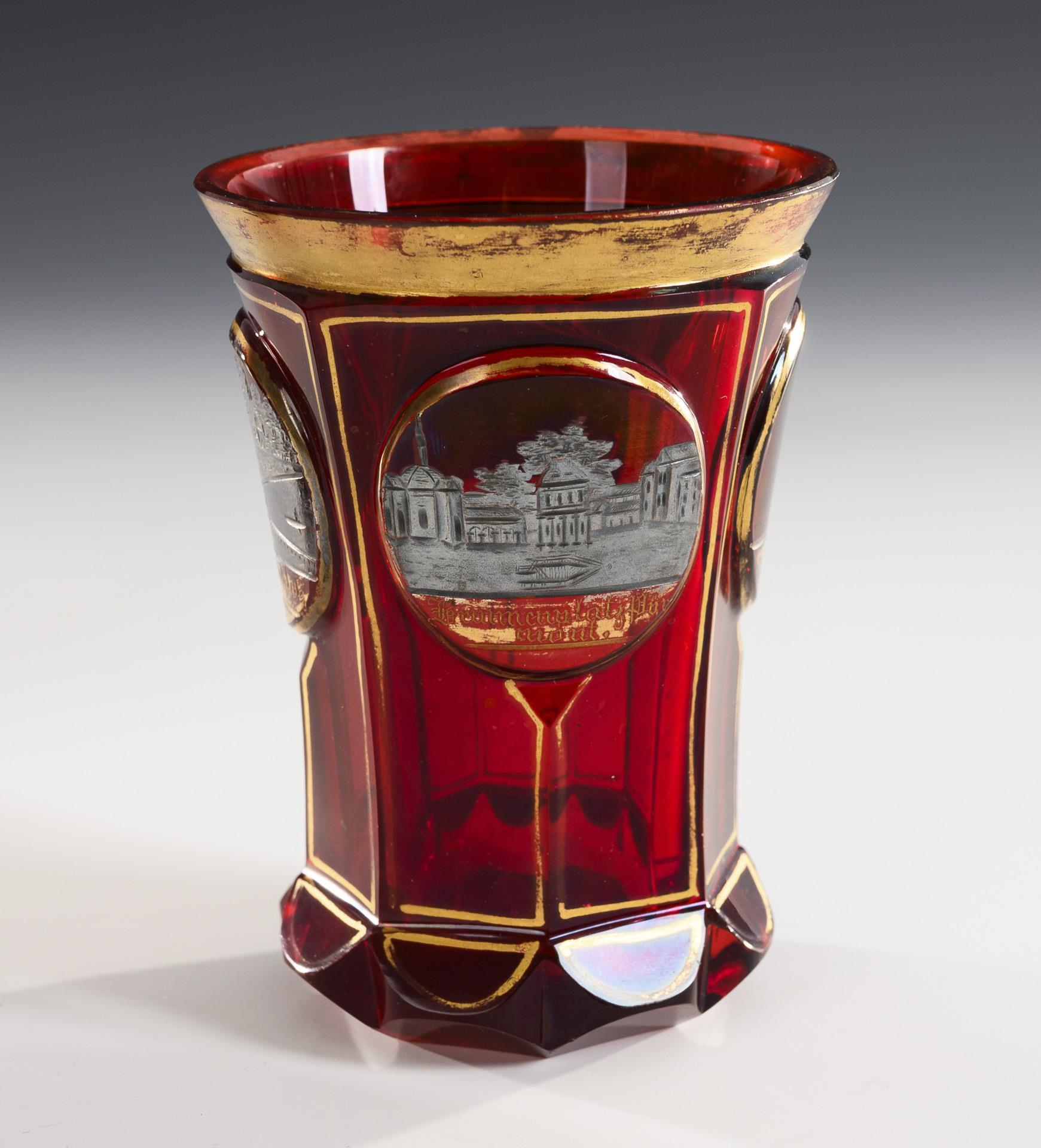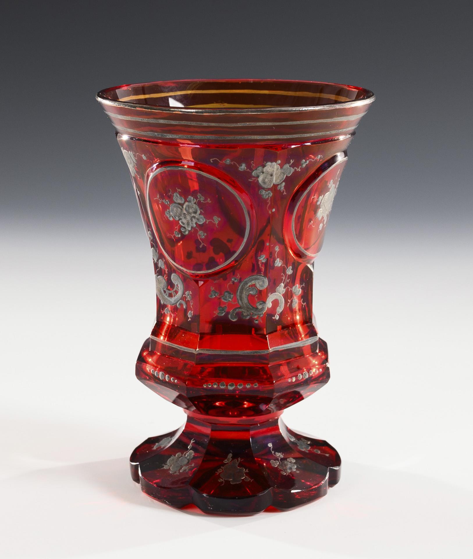 Farbloses, rot gebeiztes Glas, Gold- und Silberstaffage. H 10-14 cm.