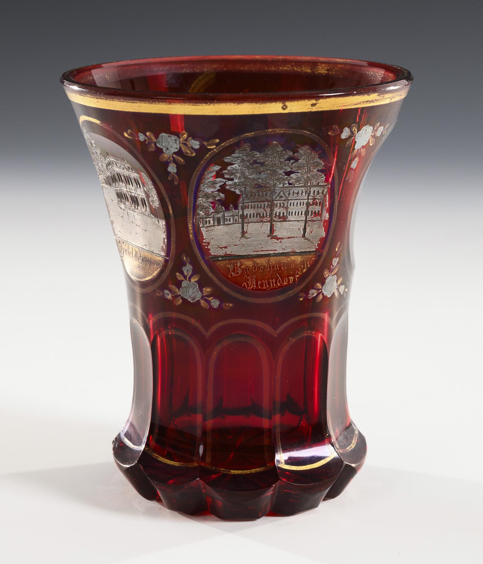 Facettierte Gläser, davon 2 Becher mit gravierten sowie silber- und goldstaffierten Ansichten von Bad Pyrmont bzw. Hannover und 1 Kelchglas mit silbergemalten Streublümchen und Rocaillen. Gold und Silber teils berieben.