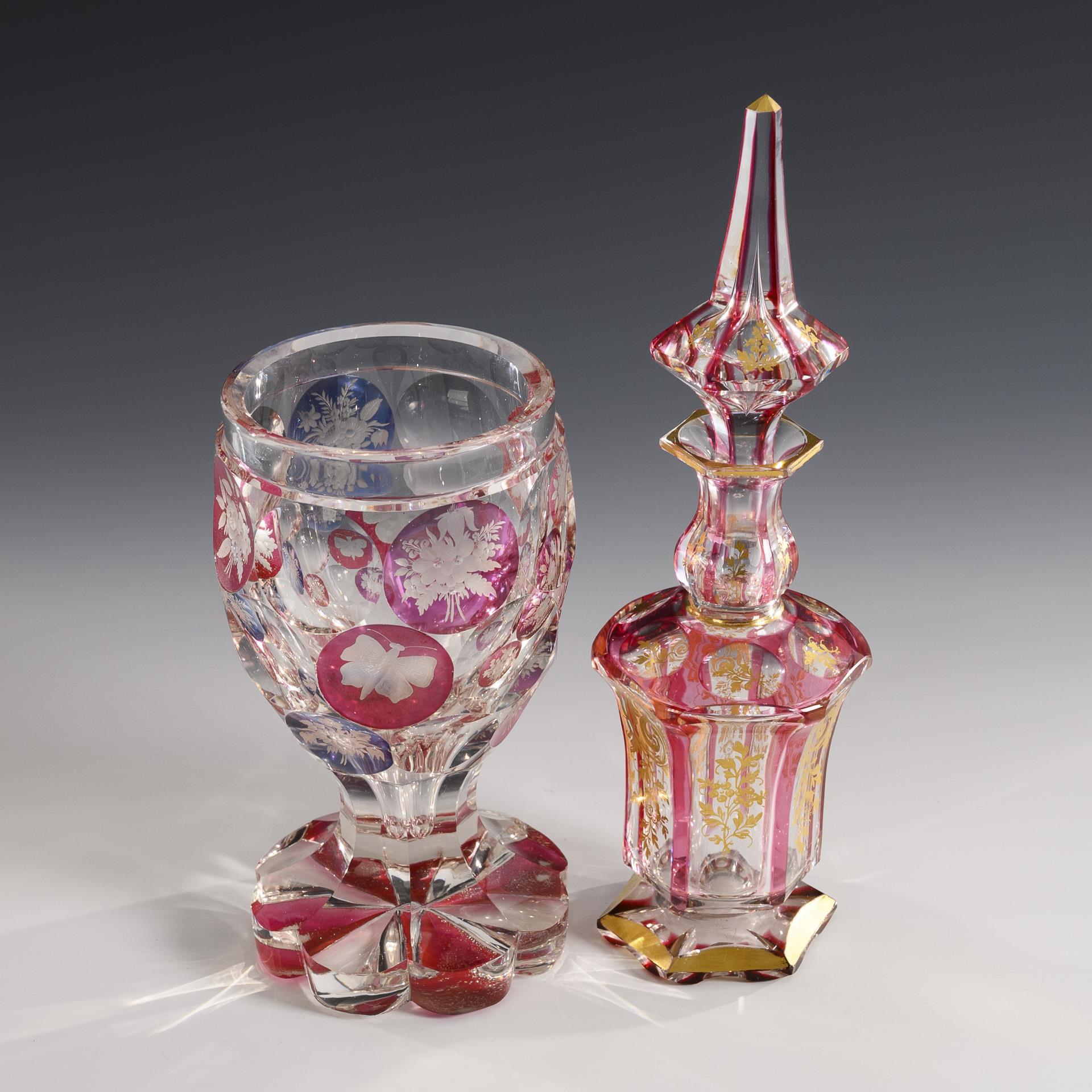1x HARRACH'SCHE GLASHÜTTE NEUWELT, um 1850: sechsfach facettierte Karaffe mit Glockenkorpus und spitzem Stopfen; aus farblosem Glas mit rosafarbenem Überfang, Linsenschliff und floraler Goldmalerei (H 24,5 cm). / 1x FRIEDRICH EGERMANN?, um 1840: Kelchglas aus farblosem, partiell rosa bzw. hellblau gebeiztem Glas mit Linsen- und Facettenschliff sowie gravierten Blumenbuketts und Schmetterlingen (H 17 cm). Partiell minimale Chips an den Schliffkanten.