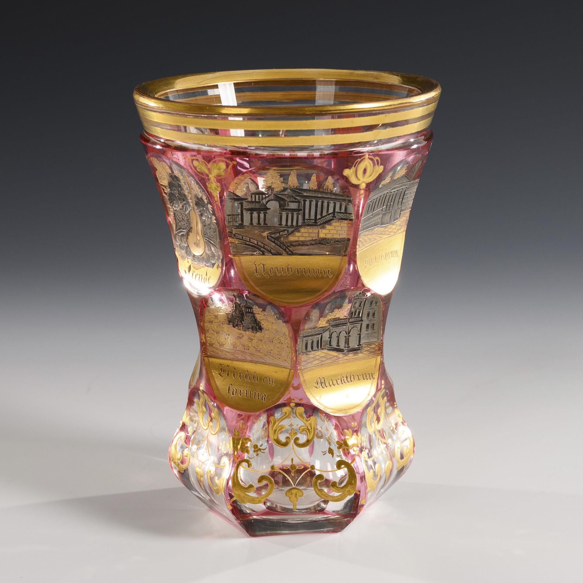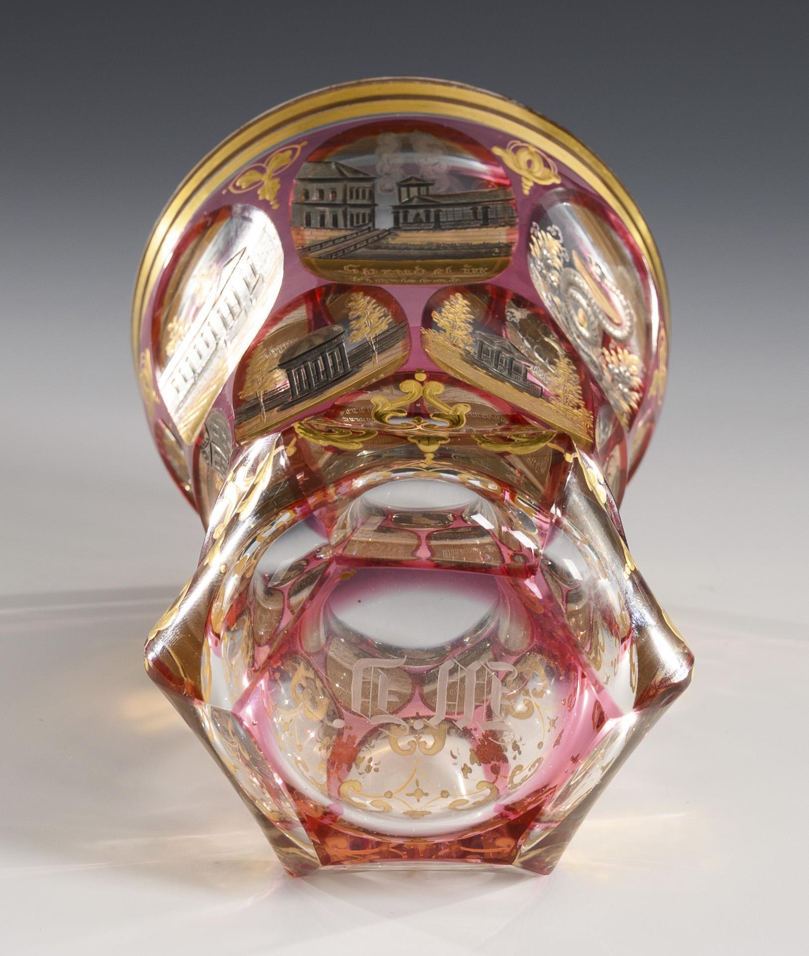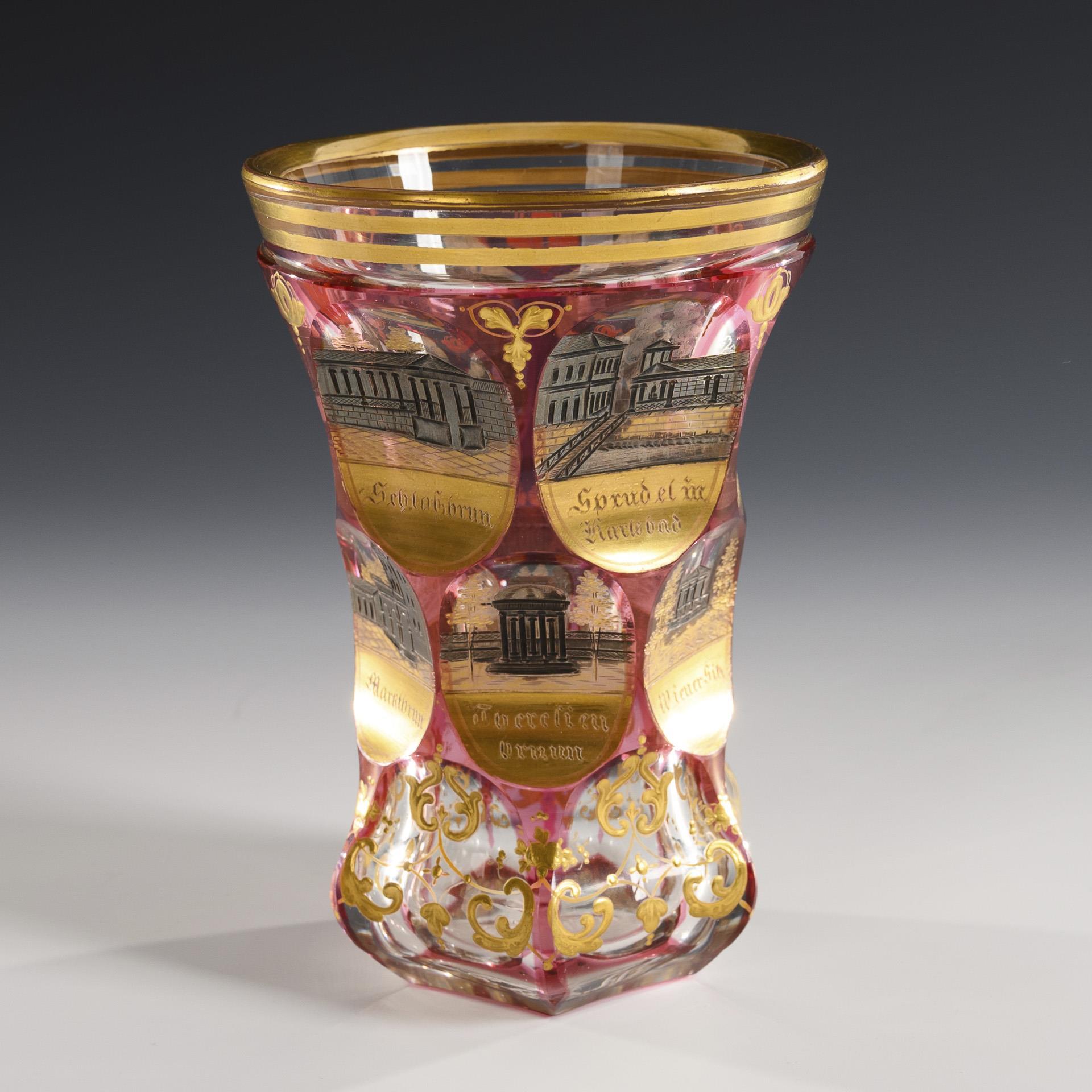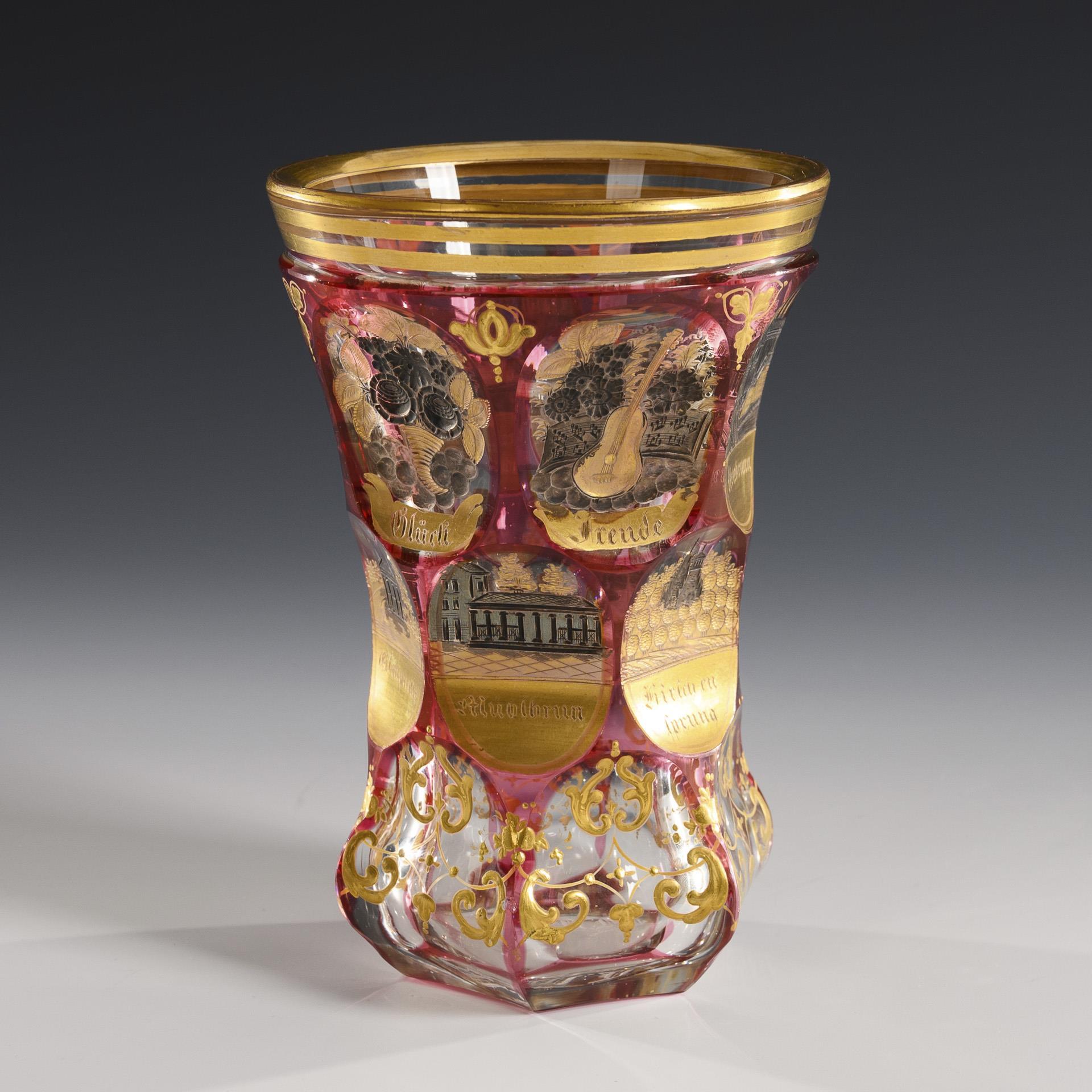 Sechsfach facettierter Glockenbecher mit gravierten und bezeichneten Ansichten von Karlsbad sowie mit Freundschaftssymbolen für Gesundheit, Glück und Freude, unterseitig das Monogramm "M.D.". Minimale Randbestoßung sowie 1 minimale Bestoßung an 1 Schliffkante.