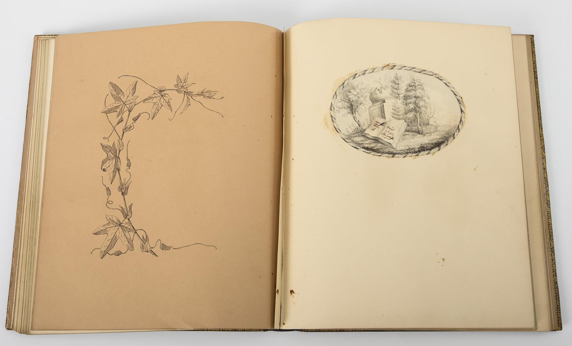 Freundschaftsalbum (Liber amicorum) mit etlichen leeren Seiten, teils mit vorgedruckten bzw. geprägten Rahmungen. Die Einträge sind zumeist in englisch, 1x französisch. Dabei 2 Tuschzeichnungen (darunter 1 großes aufwändiges Mädchenporträt ohne Signatur vor dem Eintrag von 1870 von R. Montgomery; eventuell Robert Montgomery 1839 Antwerpen - 1893 ebd.), 2 aquarellierte Lithografien, 3 Bleistiftzeichnungen, 1 ausgeschnittenes Aquarell (Trauben), 1x bemalte Seide, 1x gespritzter Zweigabdruck, 1x aufgeklebte Blätter, 1 Nadelstichbild, 2 Fotodrucke (1x im gemalten Blumenrahmen). Die meisten Einträge bis 1888, ein später Eintrag von 1924. Wenige Alters-/Gebrauchsspuren. Schutzumschlag ergänzt.