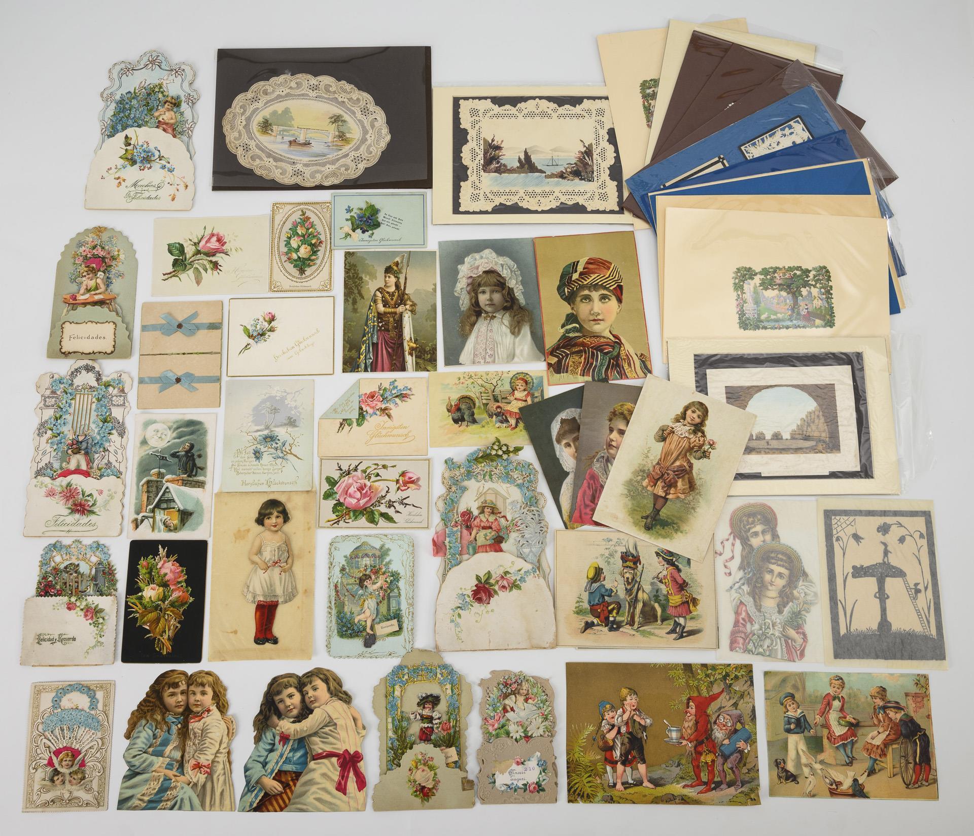 Teils recht große Farblithografien (meist Mädchen, 1x mit Werbung für Zichorienkaffee von Bériot, Lille), etliche Kulissenaufsteller, einige Oblaten, 4 Aquarelle, davon 1x mit Naturmaterialien (Landschaften/Küsten) zumeist in geprägten Papierrahmen, 2 Sandbilder (Landschaften) in geprägten Papierrahmen, 1 Tuschzeichnung in der Art von Scherenschnitten, 2 geprägte englische Todesanzeigen (1878 bzw. 1879). In Schatulle mit teils geprägtem Kunstleder. Teils Alters-/Gebrauchsspuren, teils kleinere Fehlstellen.