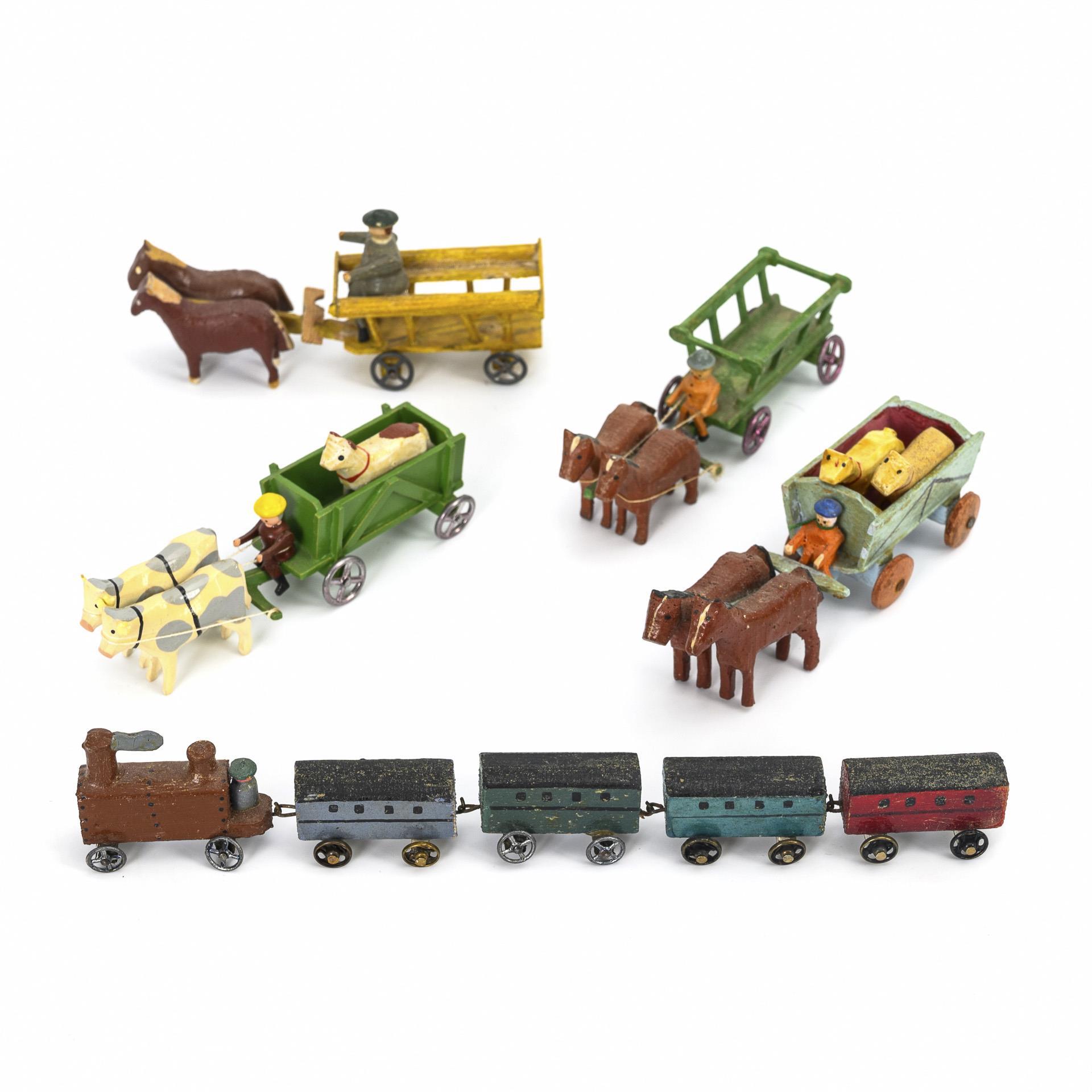 Farbig bemaltes Holz, teils mit Zinnrädern. L 3 - 9 cm.