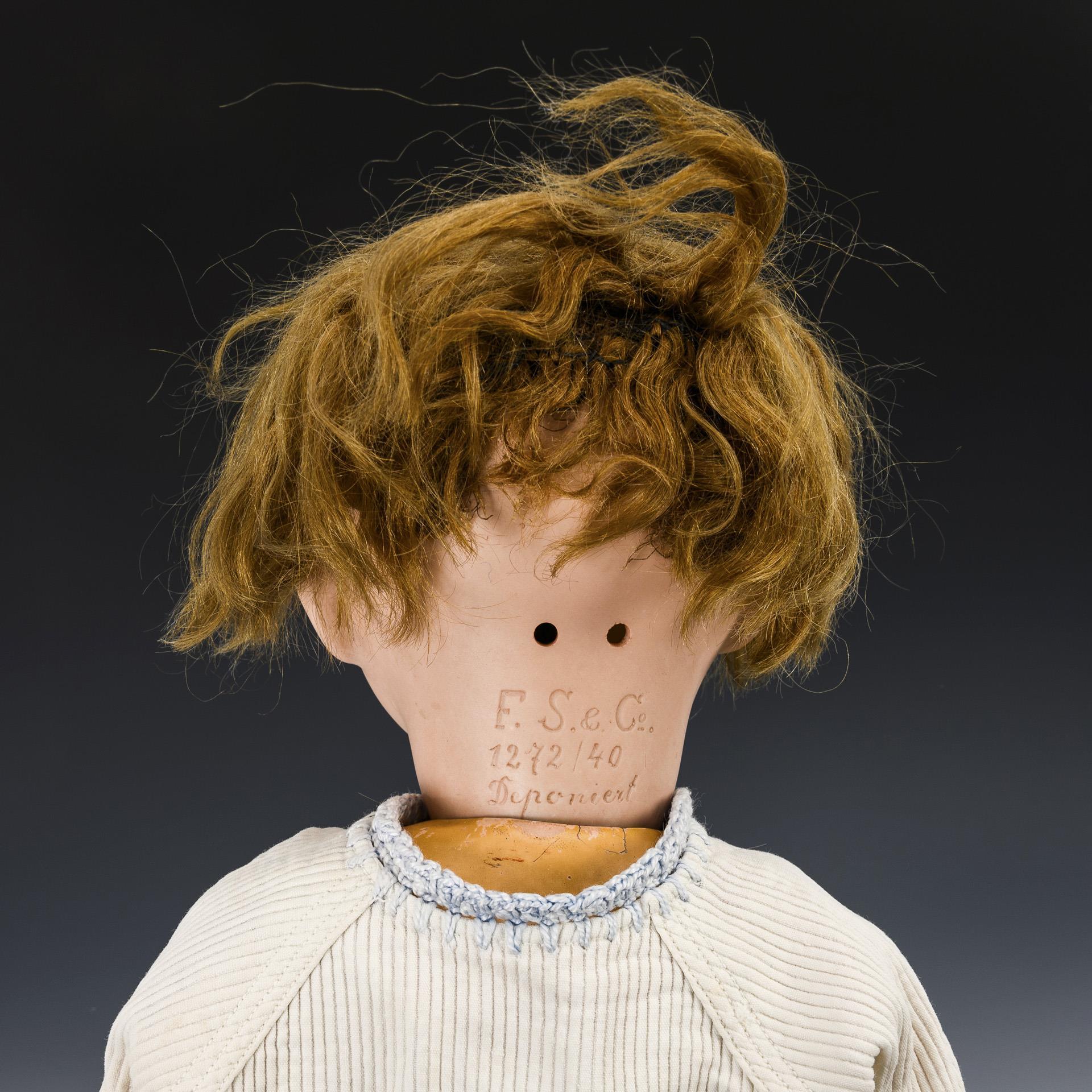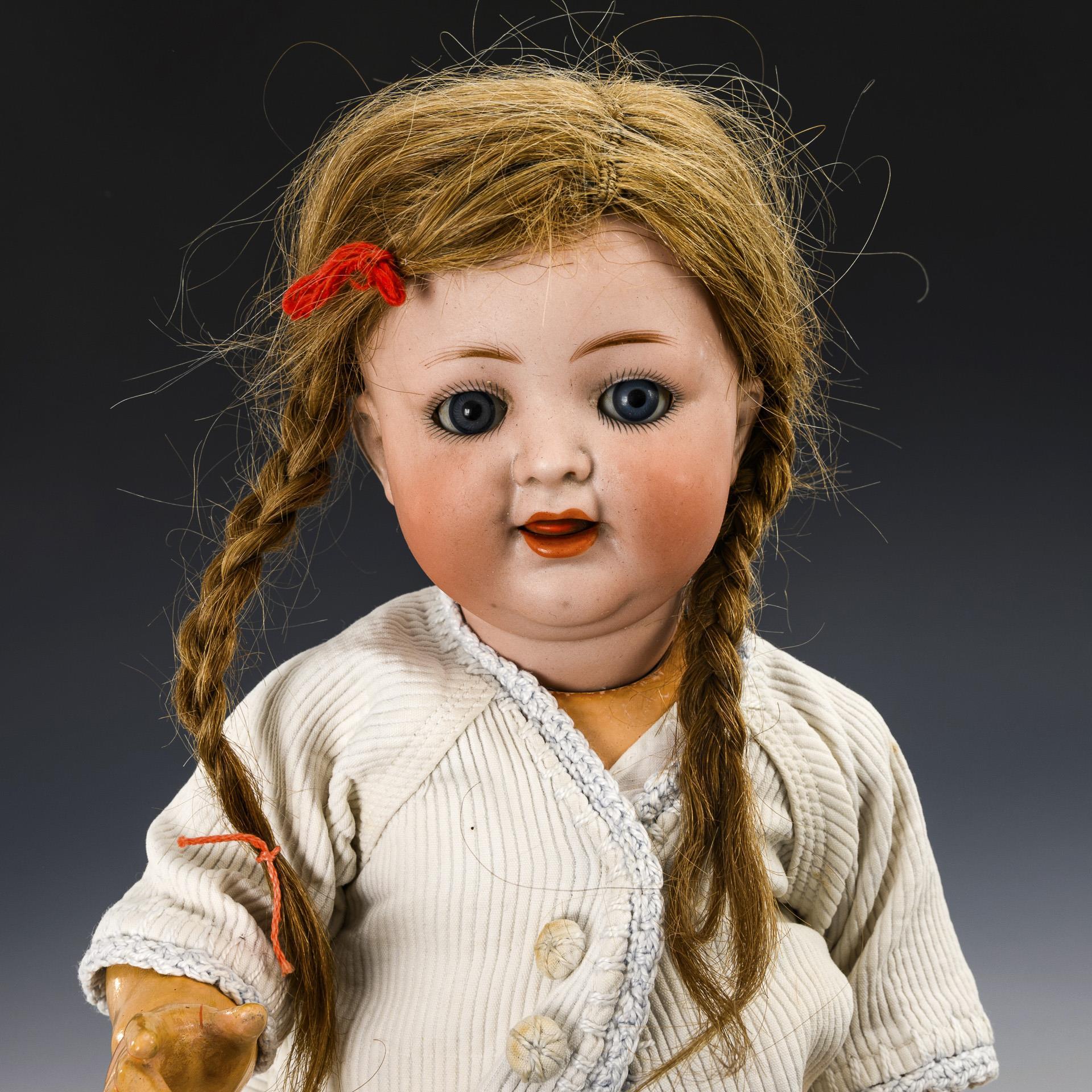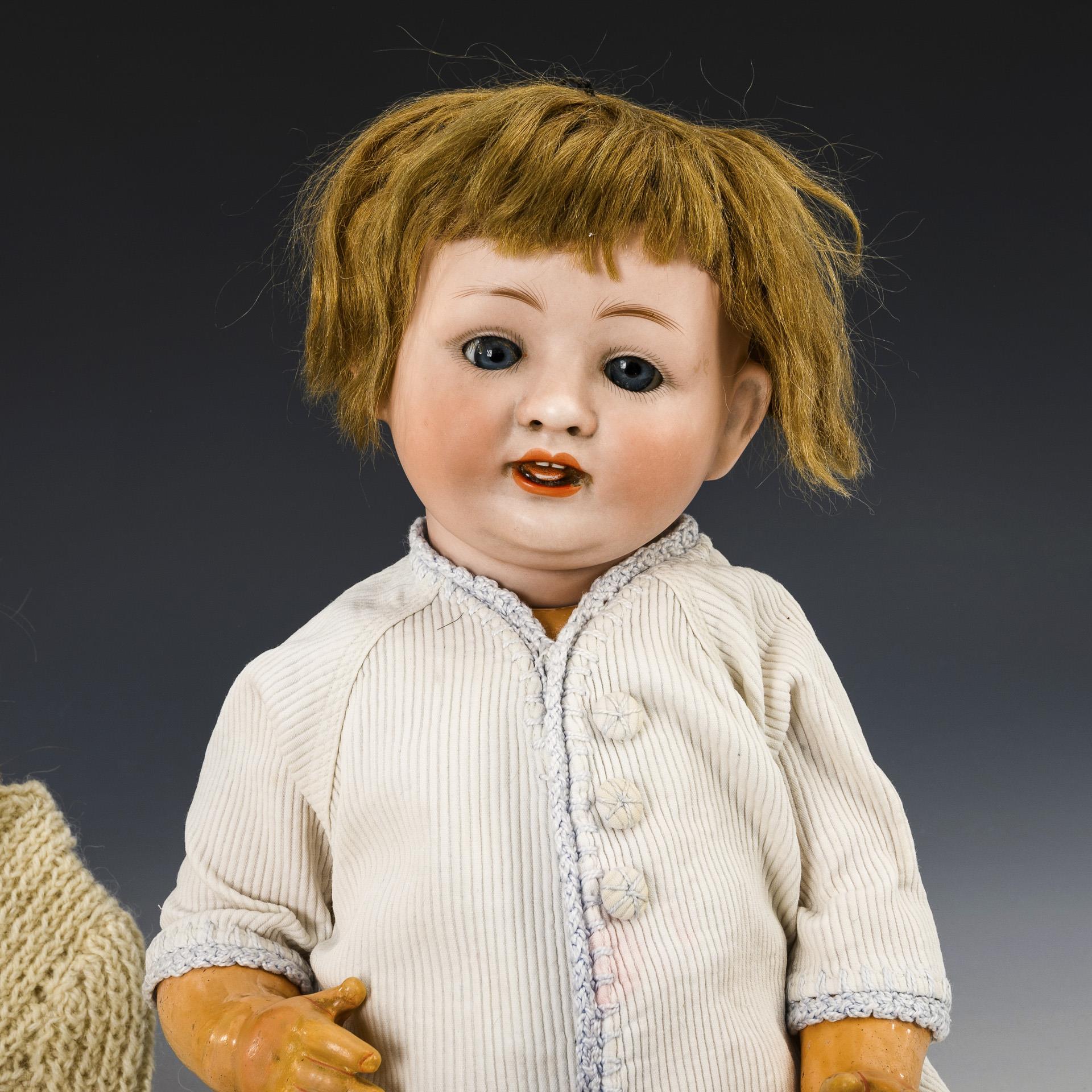 Hans (Kopfmarke: FS & Co 1272/40 Deponiert) mit Kurbelkopf, blauen Schlafaugen, offenen Nasenlöchern, modellierter Zunge, blonder Mohairperücke und 5-teiligem Sitzbabykörper (L 40 cm). / Grete (Kopfmarke: K & R / S & H 126, mit "W" auf der Stirn) mit Kurbelkopf, blauen Schlafaugen, beweglicher Zunge, dunkelblonder Echthaarperücke mit Zöpfen und 5-teiligem Stehpuppenkörper (L 38 cm). Beide mit weißer Baumwollkleidung und zusätzlicher Bekleidung (teils 1950er Jahre). Köpfe durchleuchtet: Kopf des Mädchens ohne Defekte, Junge mit Chips an der Halskurbel und der Unterlippe, 1 Auge etwas tiefer liegend.