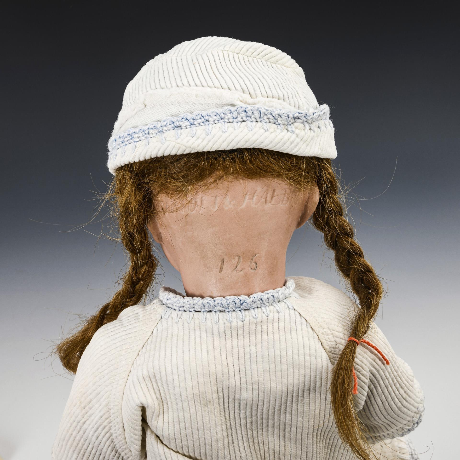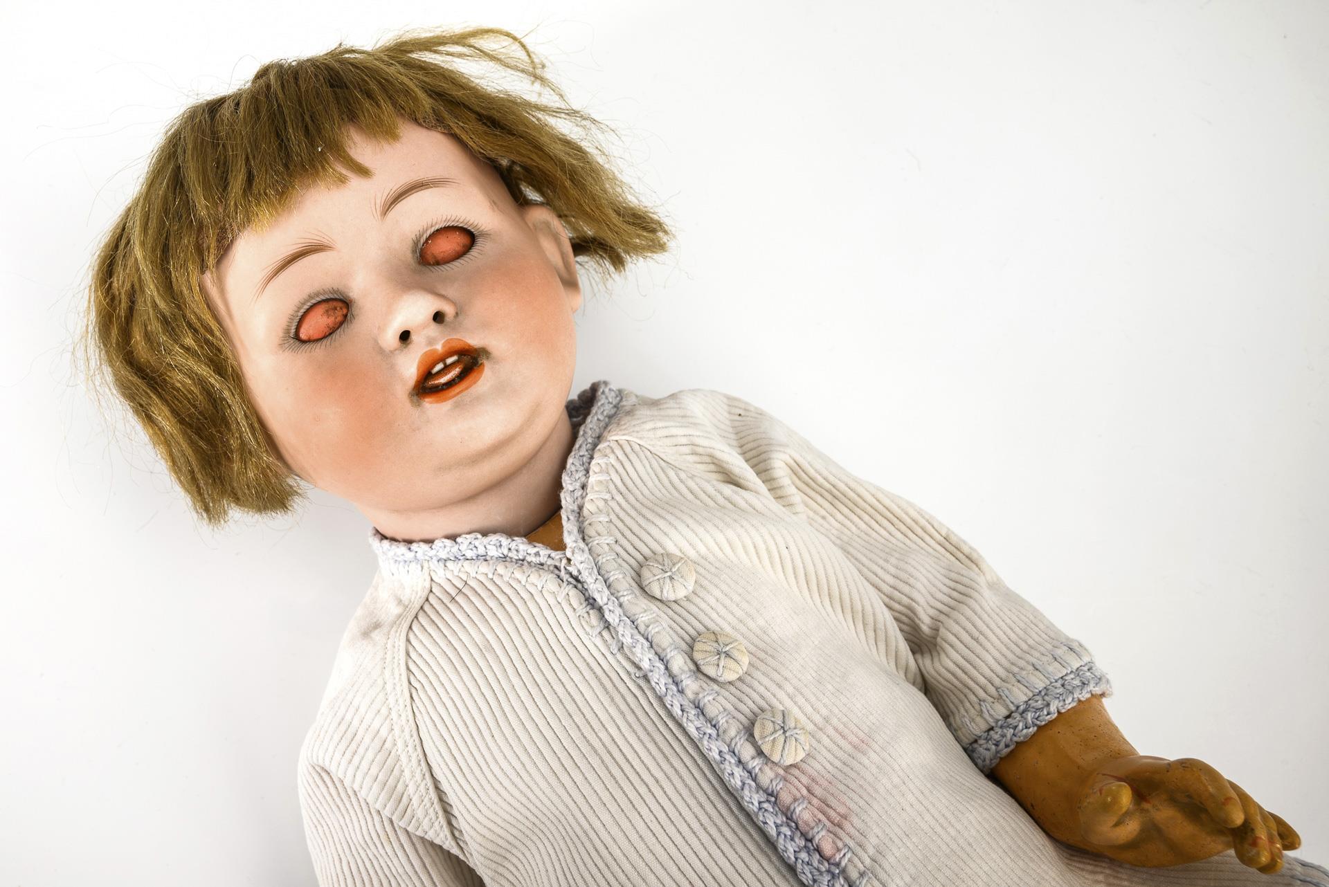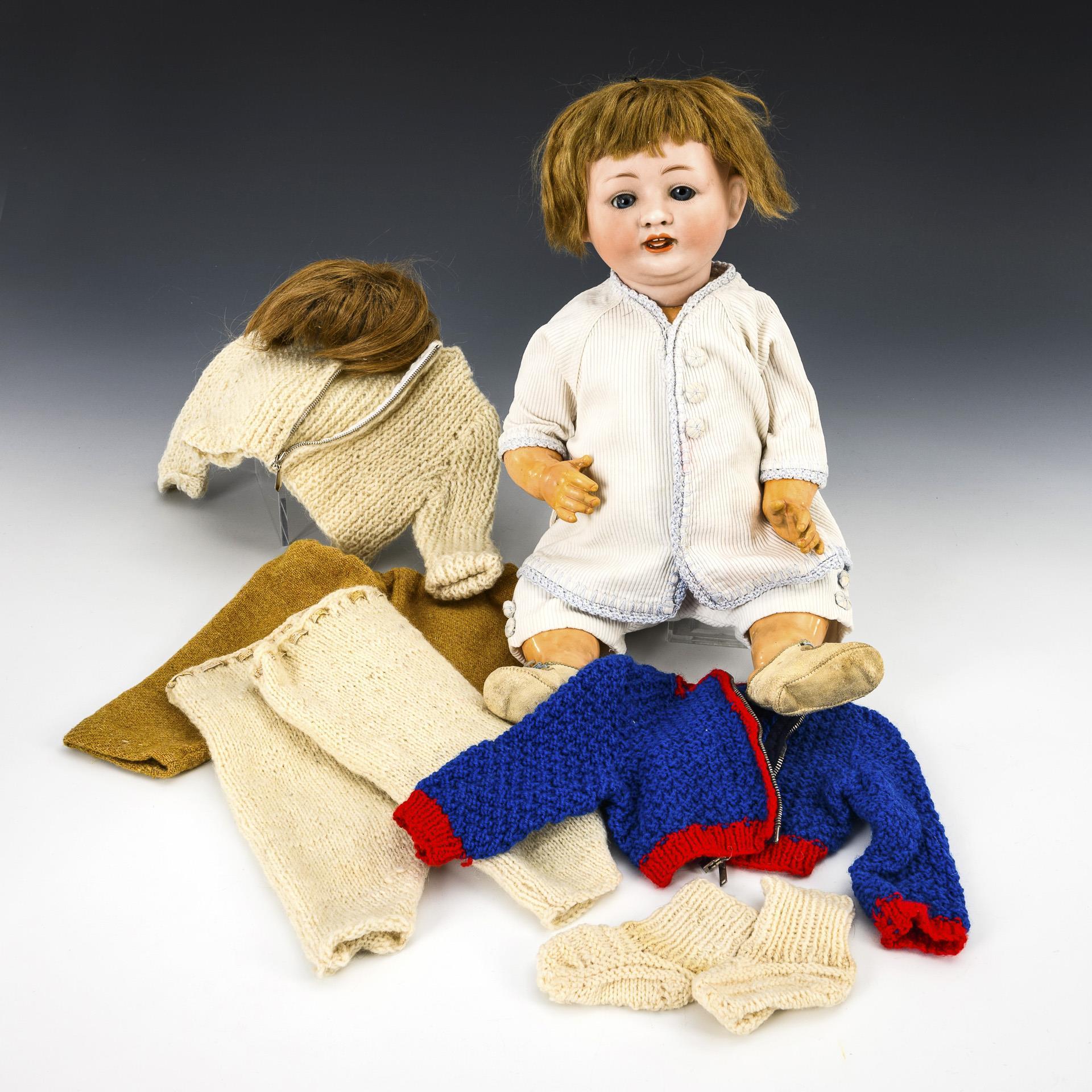 Hans (Kopfmarke: FS & Co 1272/40 Deponiert) mit Kurbelkopf, blauen Schlafaugen, offenen Nasenlöchern, modellierter Zunge, blonder Mohairperücke und 5-teiligem Sitzbabykörper (L 40 cm). / Grete (Kopfmarke: K & R / S & H 126, mit "W" auf der Stirn) mit Kurbelkopf, blauen Schlafaugen, beweglicher Zunge, dunkelblonder Echthaarperücke mit Zöpfen und 5-teiligem Stehpuppenkörper (L 38 cm). Beide mit weißer Baumwollkleidung und zusätzlicher Bekleidung (teils 1950er Jahre). Köpfe durchleuchtet: Kopf des Mädchens ohne Defekte, Junge mit Chips an der Halskurbel und der Unterlippe, 1 Auge etwas tiefer liegend.