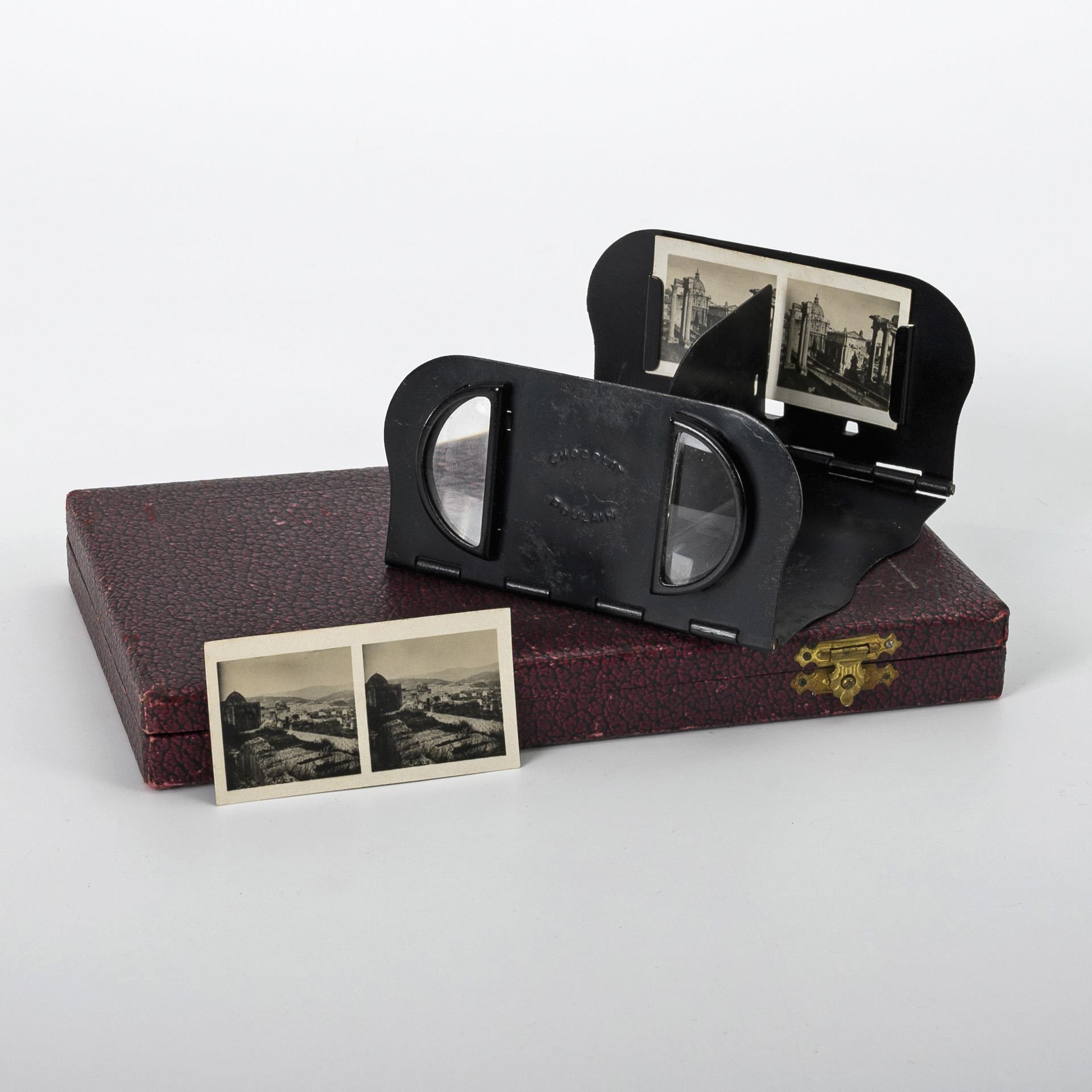 Schwarz lackiertes Eisenblech, Glaslinsen, Stereo-Fotografien, Schatulle mit rotem Lederbezug. Betrachter 10 x 10 cm, Fotokarten 3,5 x 6,5 cm, Etui 2 x 20 x 12 cm.
