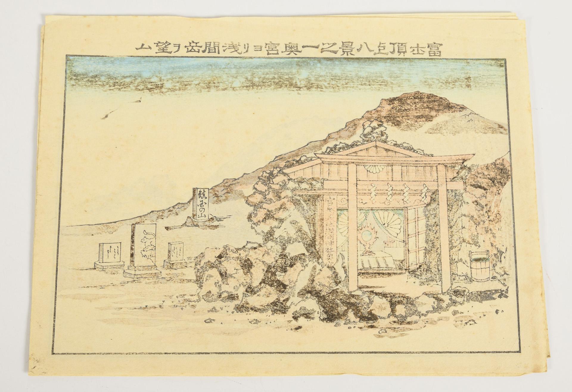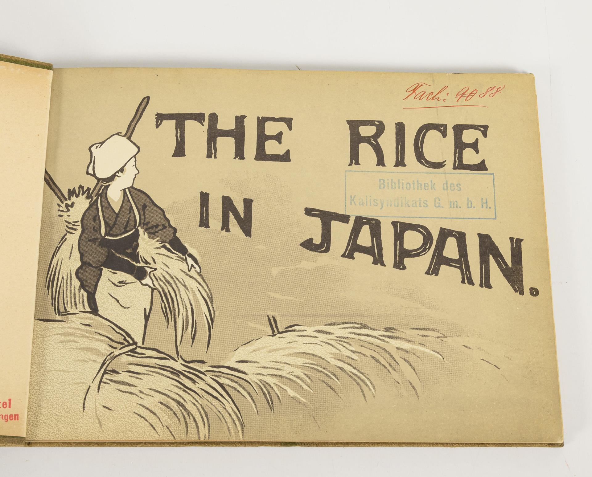 Anbau und Verarbeitung von Reis an Hand farbiger, gedruckter Fotografien, mit englischen Beschriftungen. 23 Blatt, Im geschnürten Seideneinband. (18 x 25 cm). / Dazu einige Farbholzschnitte mit Berglandschaften.