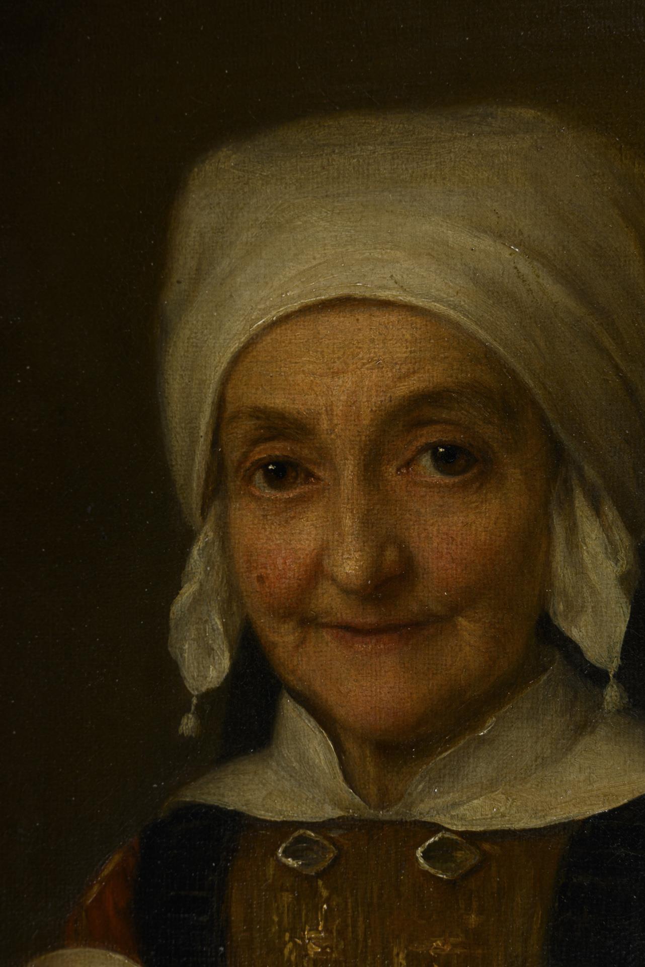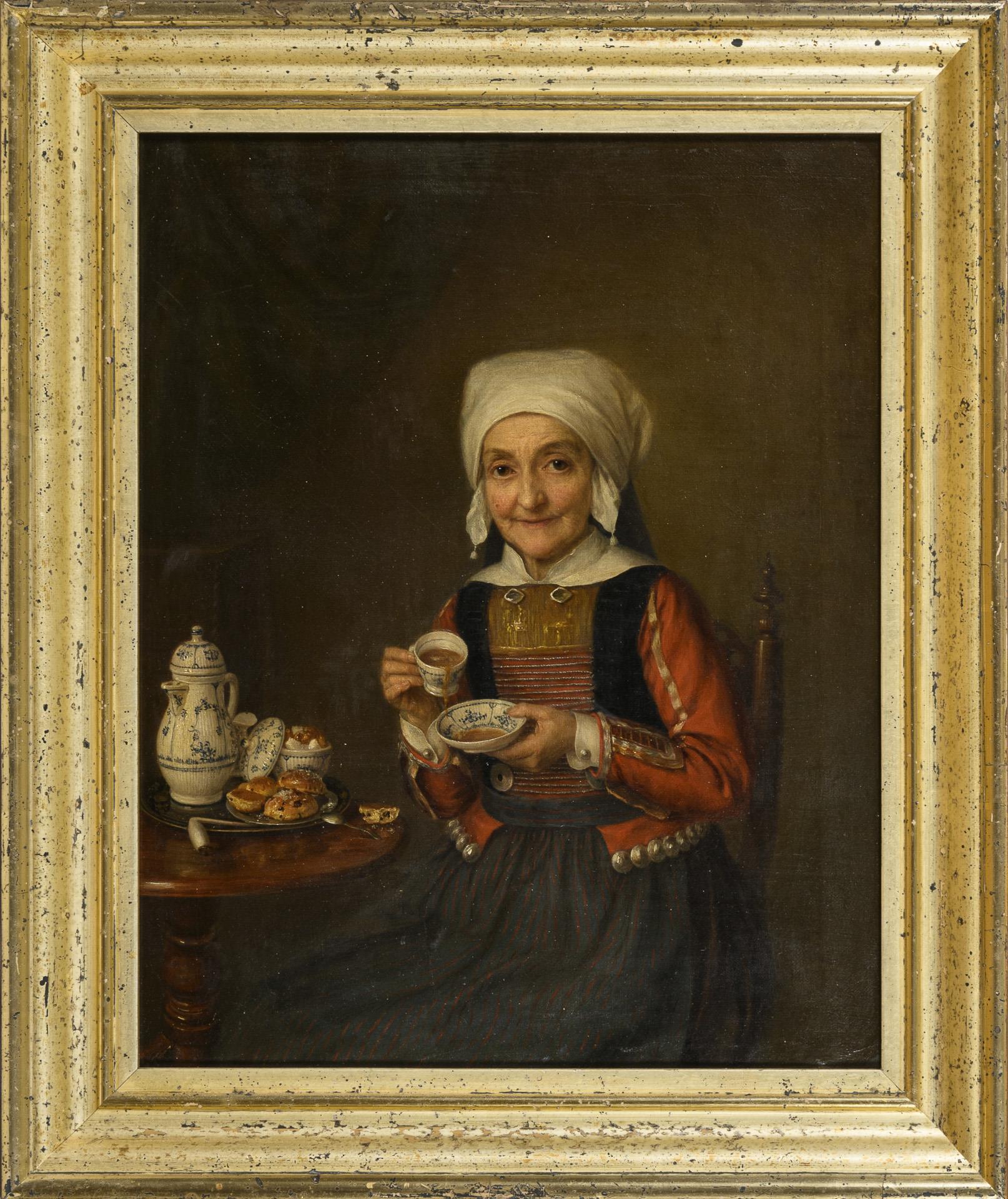 Porträt einer älteren Dame beim Verschütten des Kaffees am Tischchen mit dem fein gemalten Teeservice.