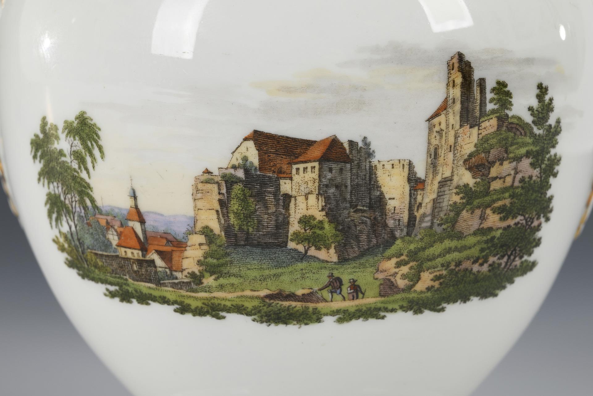 Ovoider Korpus mit zwei Volutenhandhaben und Rundfuß. Auf der Wandung die Ansicht der Festung Königstein und die Ansicht der Burg Hohnstein in Sächsischen Schweiz. Ohne Deckel.