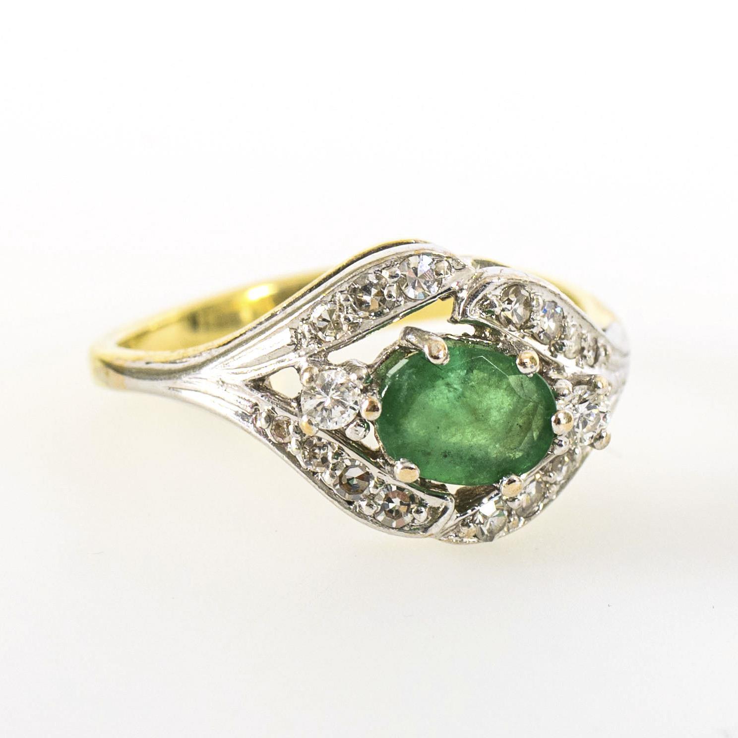 Gelb- und Weißgold 585 geprüft; der Smaragd ca. 0,60 ct, die Brillanten zusammen ca. 0,1 ct; die Diamanten zusammen ca. 0,22 ct, von mittlerem Farb- und mittlerem bis geringem Reinheitsgrad. Ringgröße 56. 4,3 g.