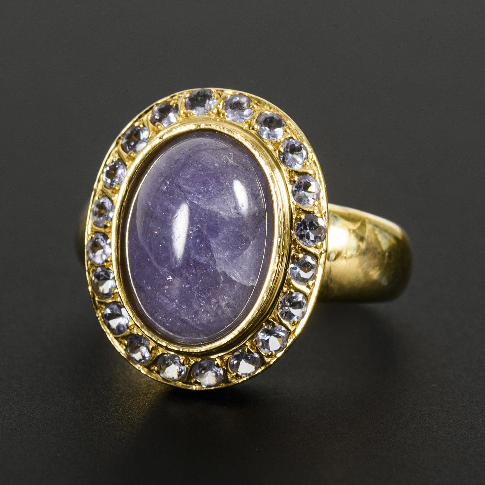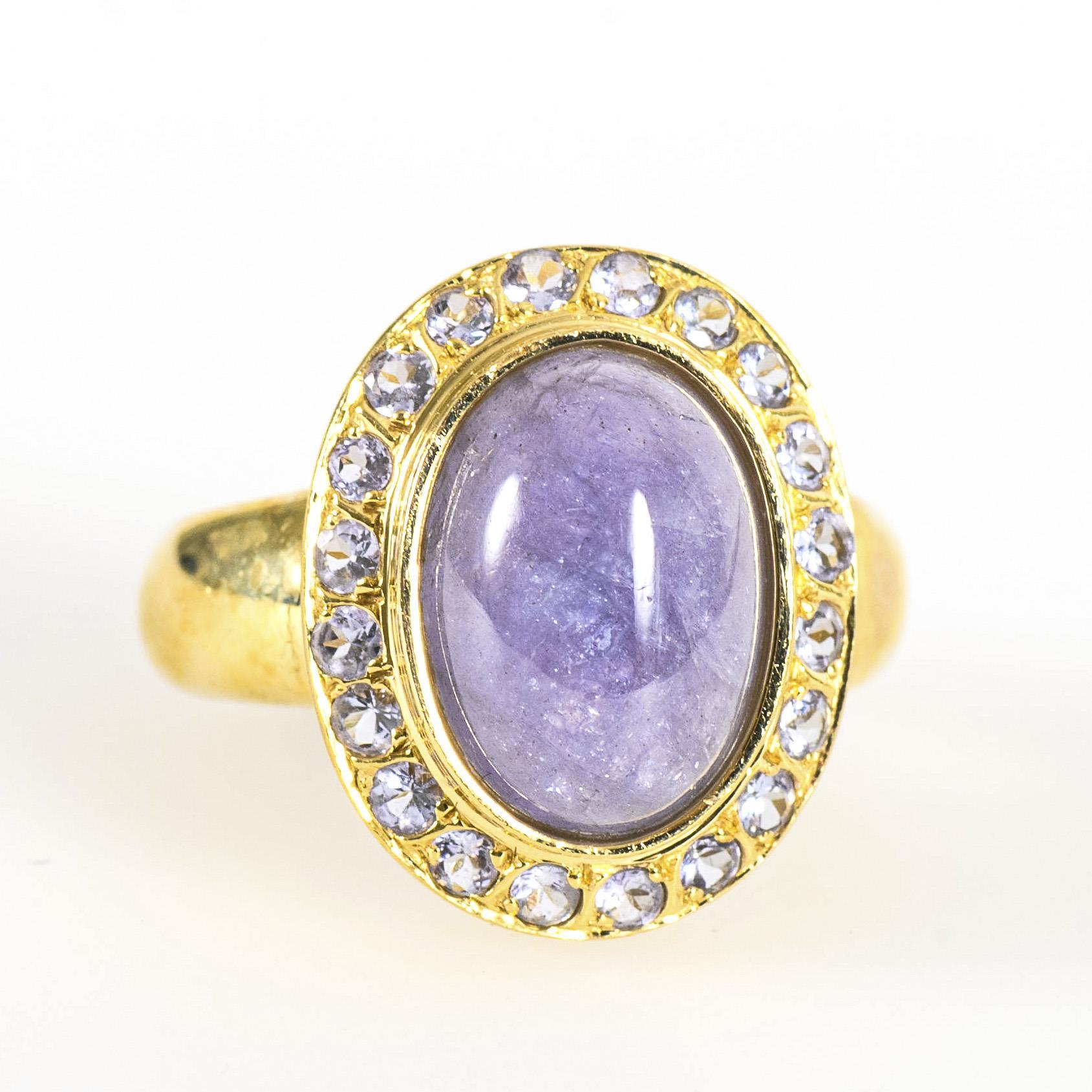 Ring mit Besatz aus einem großen Tansanit-Cabochon, umgeben von 20 pavégefassten, kleineren Tansaniten, auf breiter Schiene.