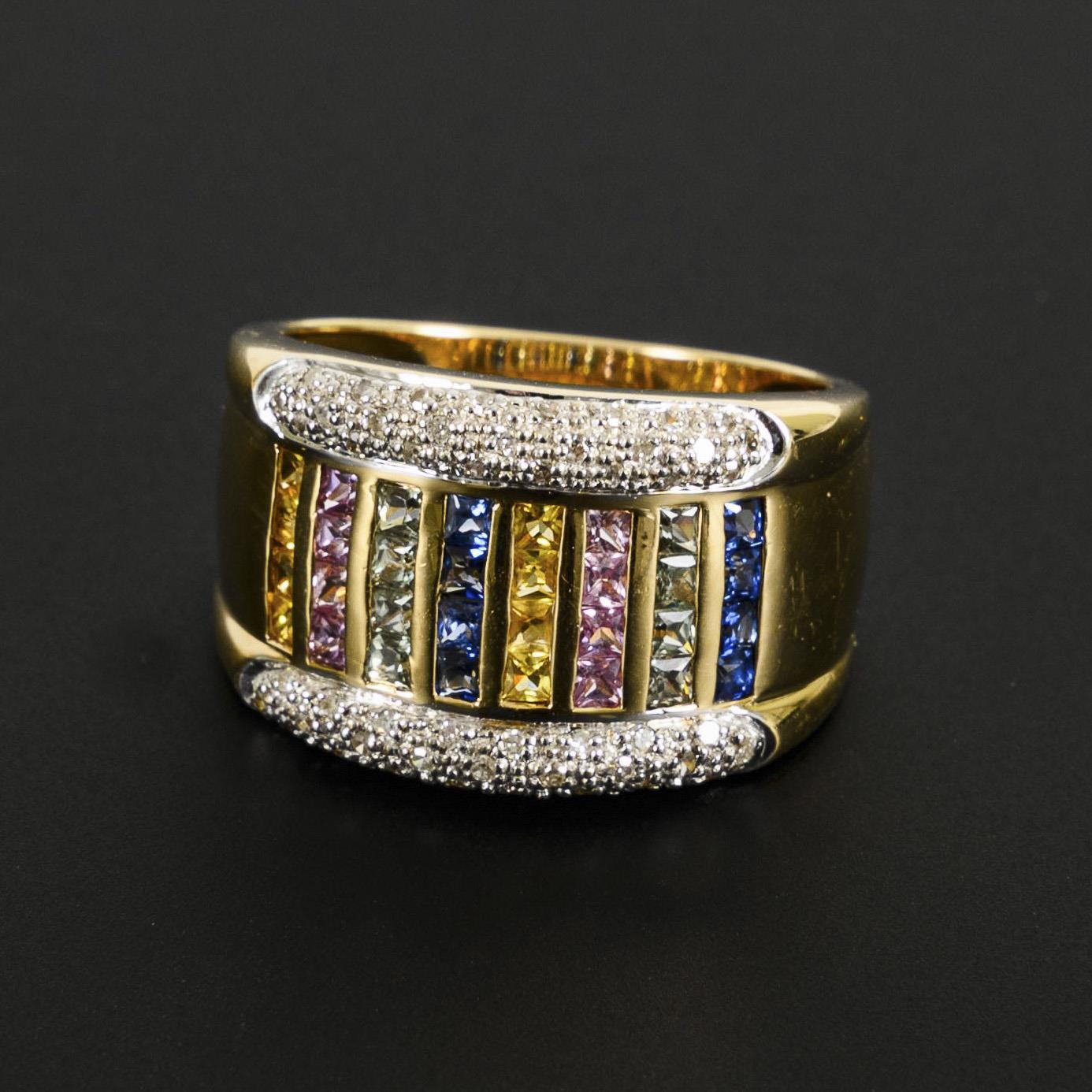 Ausgefallener, sehr breiter Bandring mit einem Besatz aus 32 kanalgefassten, bunten Saphiren, sowie 50 pavégefassten Achtkant-Diamanten. Teilrhodiniert.