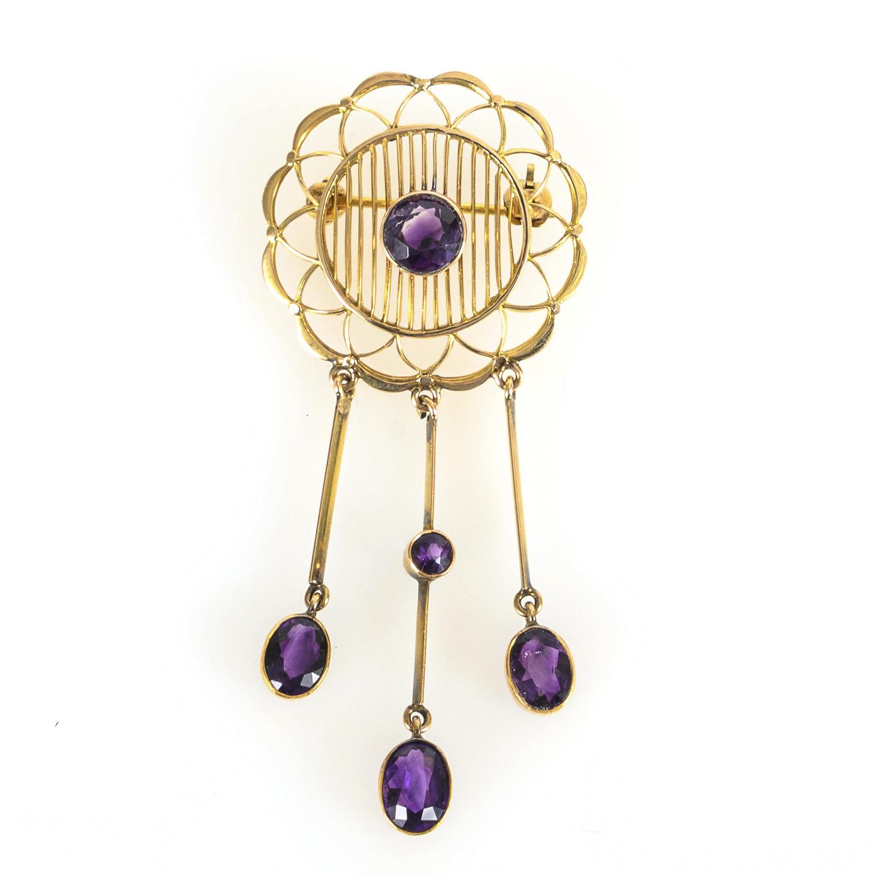 Stilisierte Blütenbrosche mit zargengefasstem Amethyst sowie 3 amethystbesetzten Stababhängungen. Kugelhaken.