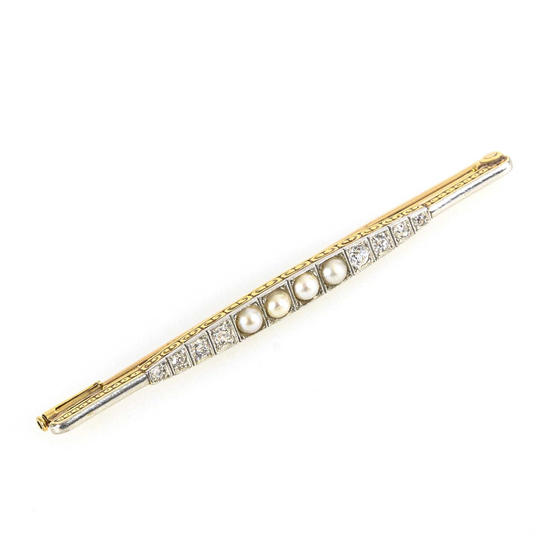 Elegante Nadel des Art déco mit 4 Halbperlen und 8 Altschliff-Brillanten in 2-farbiger Ausführung, die Nadel mit Schiebesicherung.