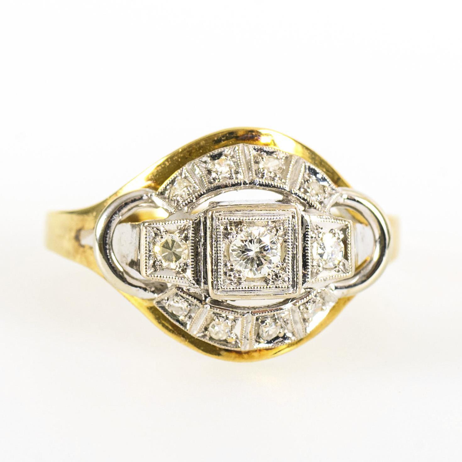 Bicolor Art déco-Ring mit Besatz aus einem zentralen Brillanten sowie 10 Achtkant-Diamanten. An der Ringschiene eine vormalige Vergrößerung leicht sichtbar.