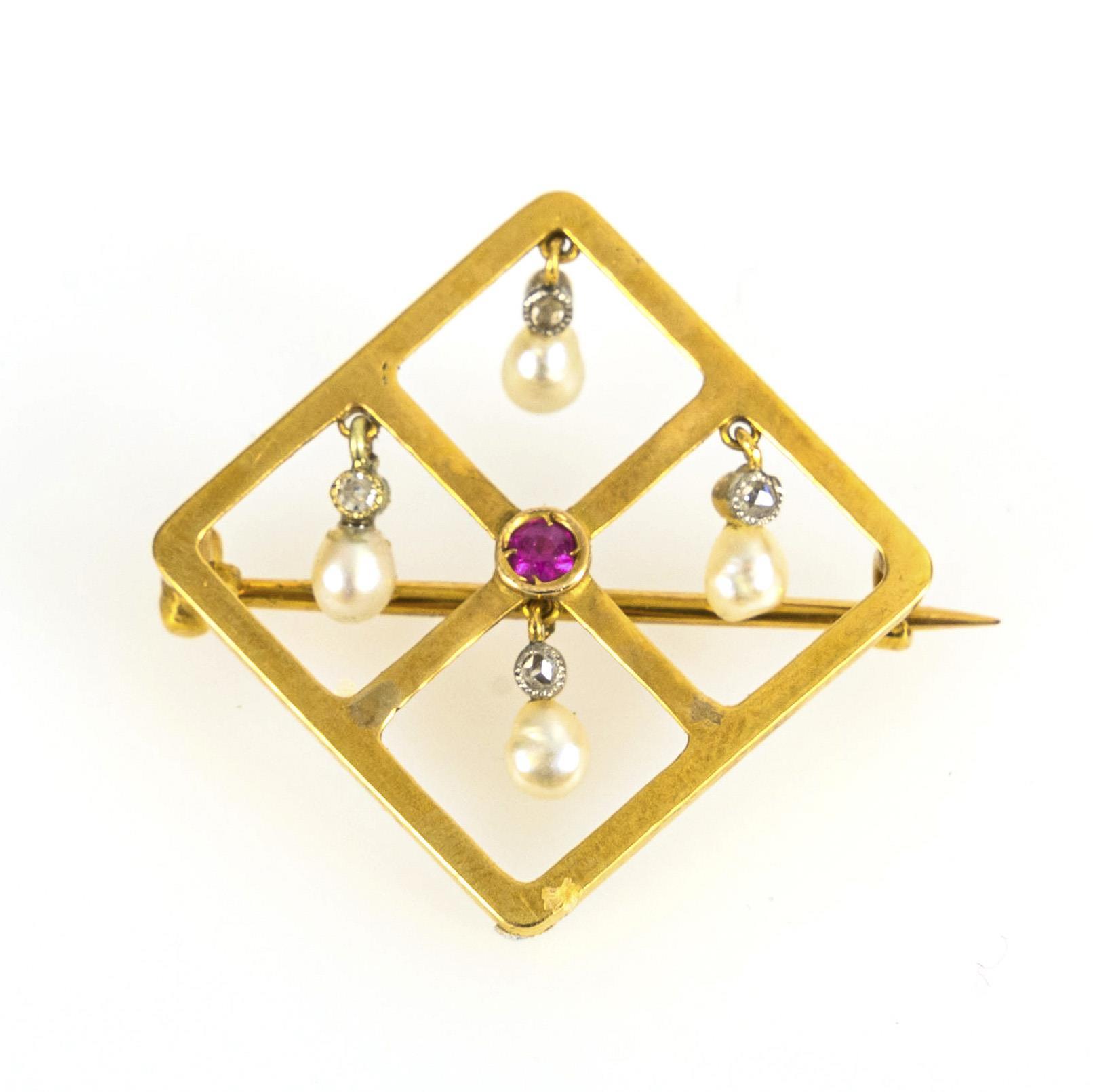 Geometrische Jugendstil-Brosche mit einem Rubin, sowie 4 Abhängungen mit je einer Diamantrose und einer wohl natürlichen Perle, die Nadel mit einem einfachen Hakenverschluss. Eine Diamantrose durch Achtkant-Diamant ersetzt.