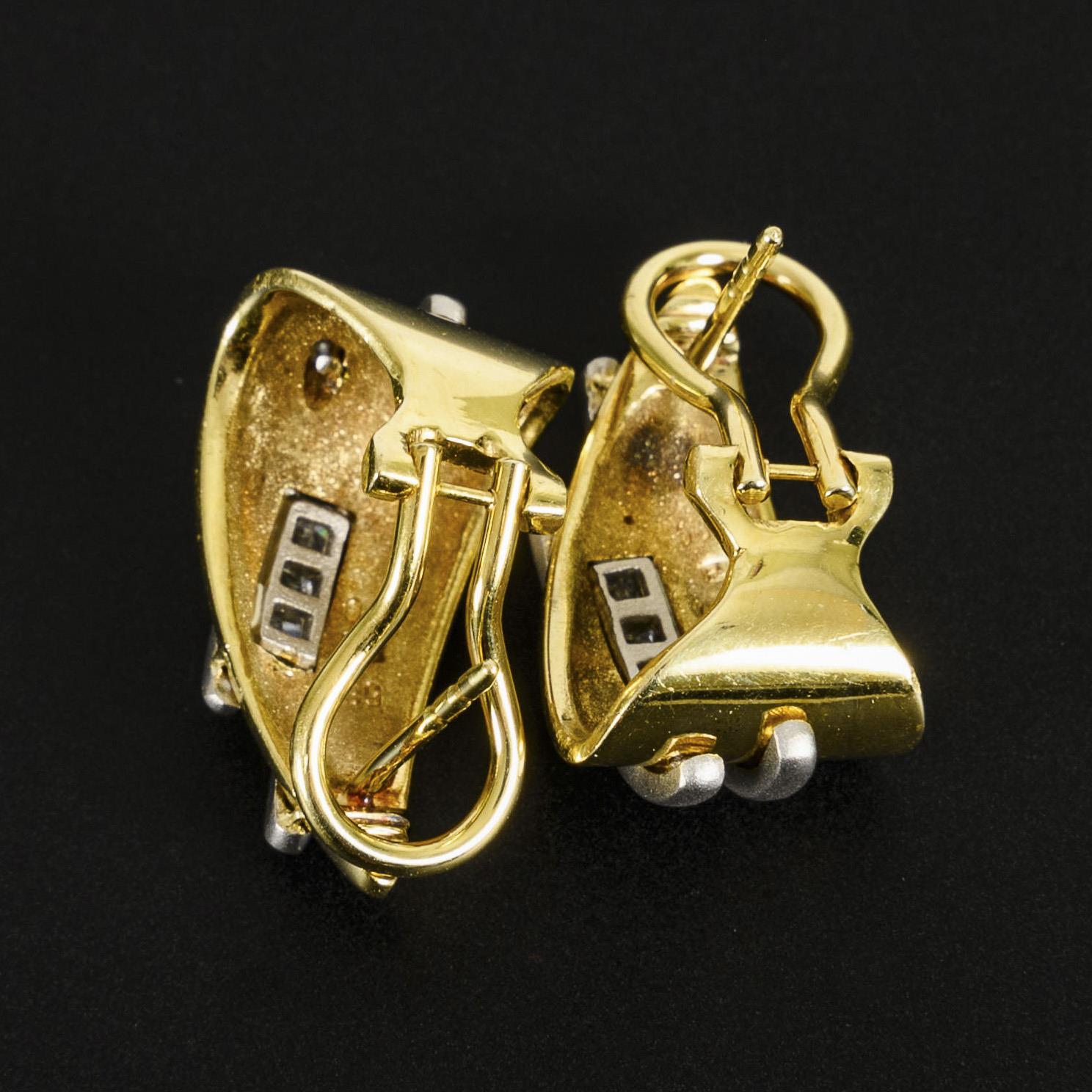Modernes bicolor Clipstecker-Paar mit je 3 Diamanten im Prinzess-Schliff.