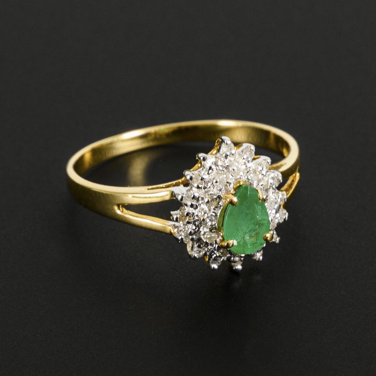 Ringkopf mit chatongefasstem Smaragd im Tropfenschliff, umgeben von 28 kleinen Achtkantdiamanten in Pavé-Fassung.